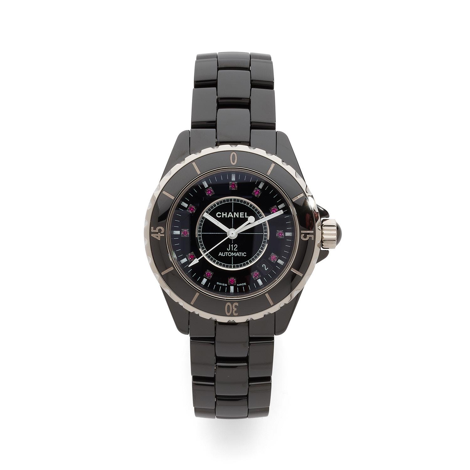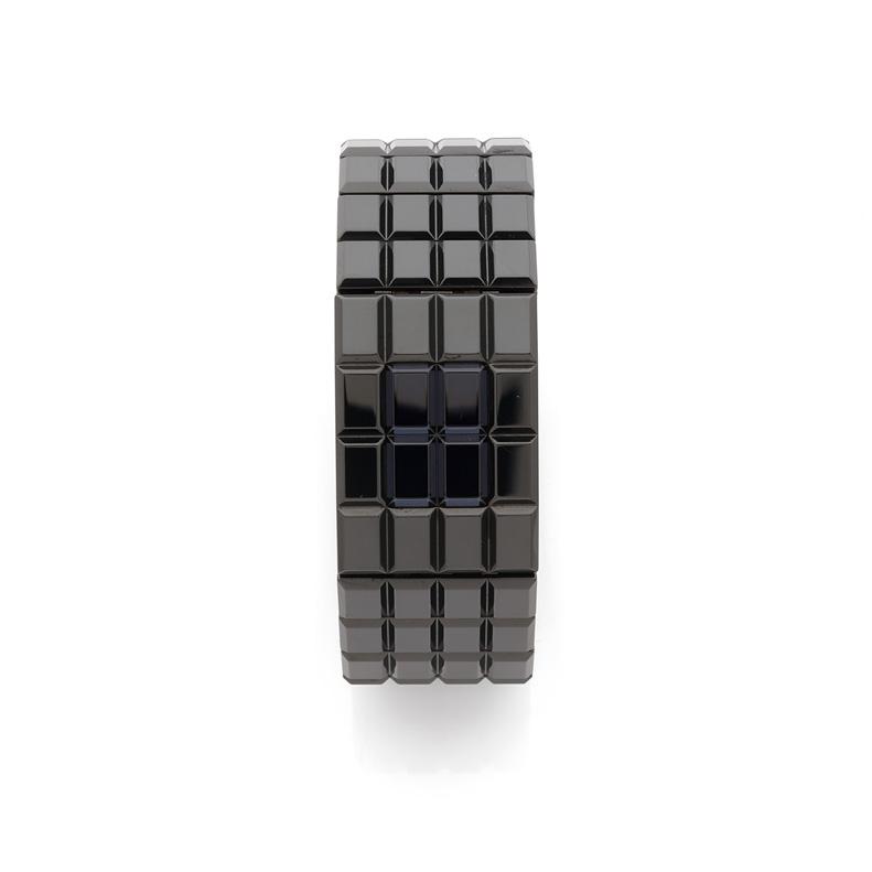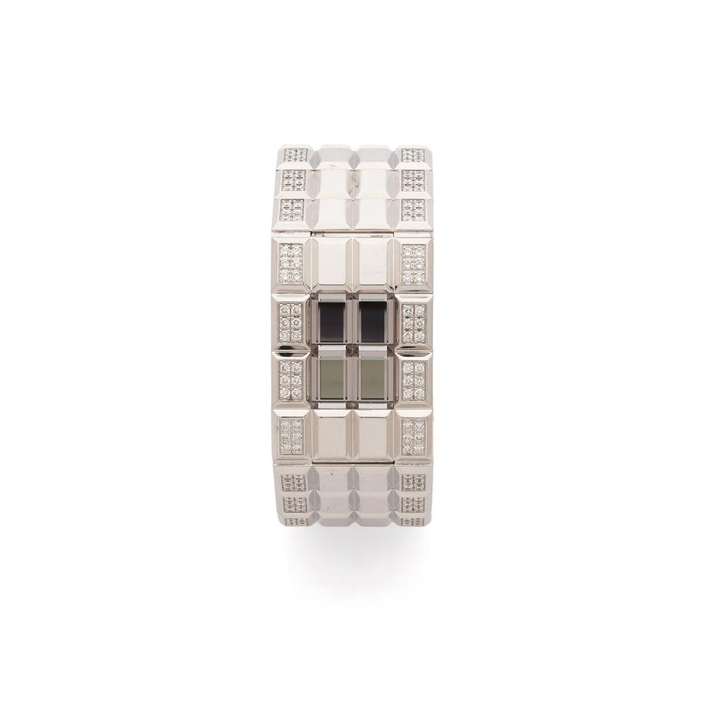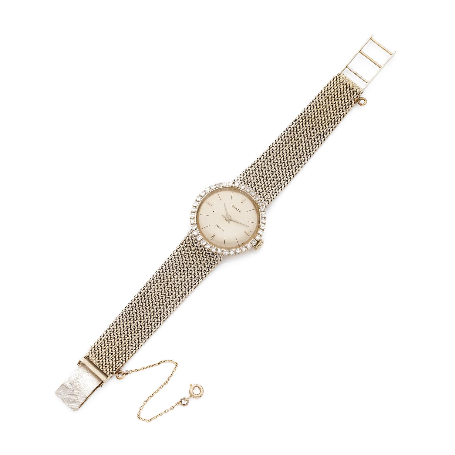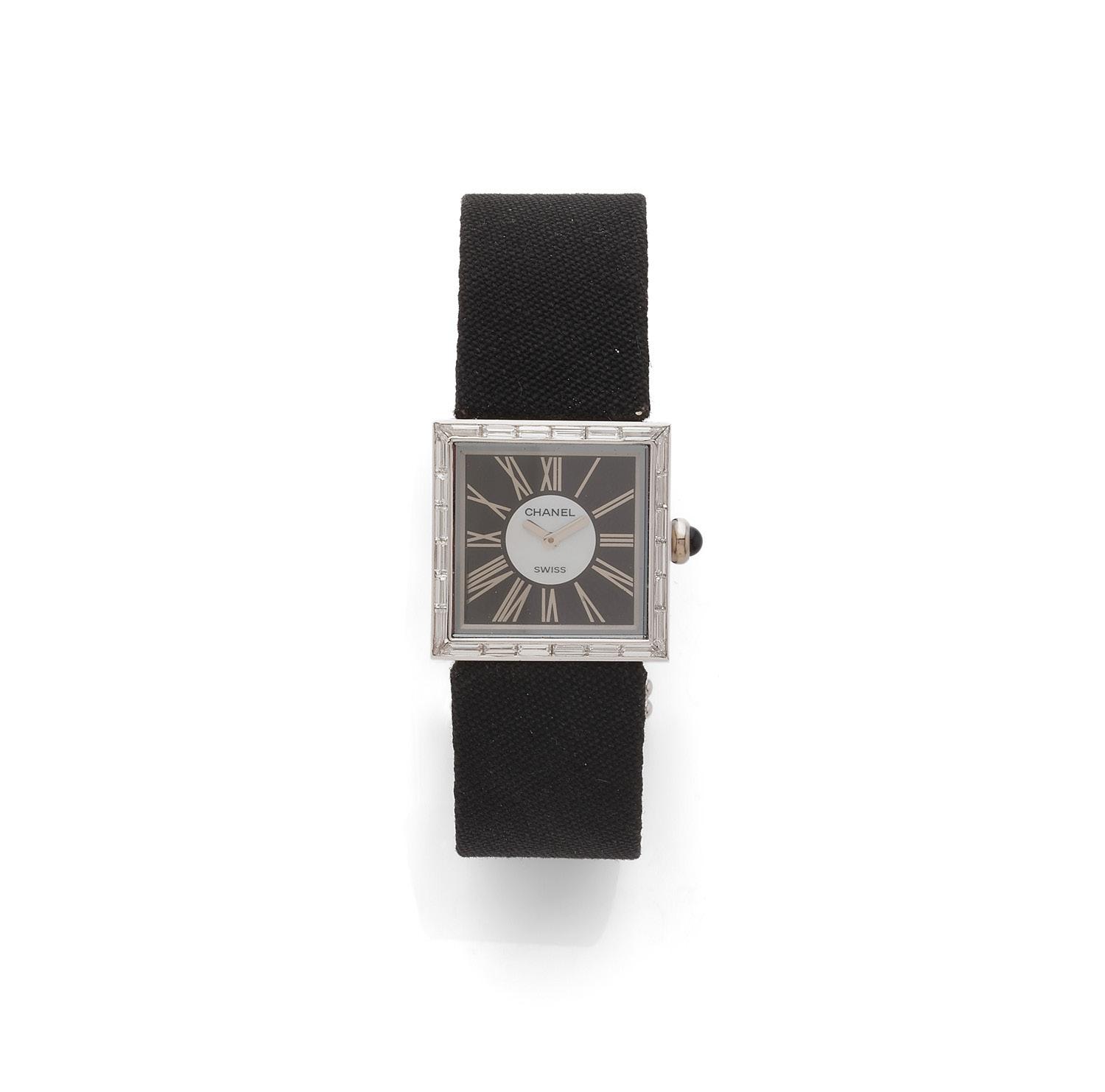 Boîtier : rond, carrure cannelée, couronne sertie d’une pierre noire, fond clipsé, signé