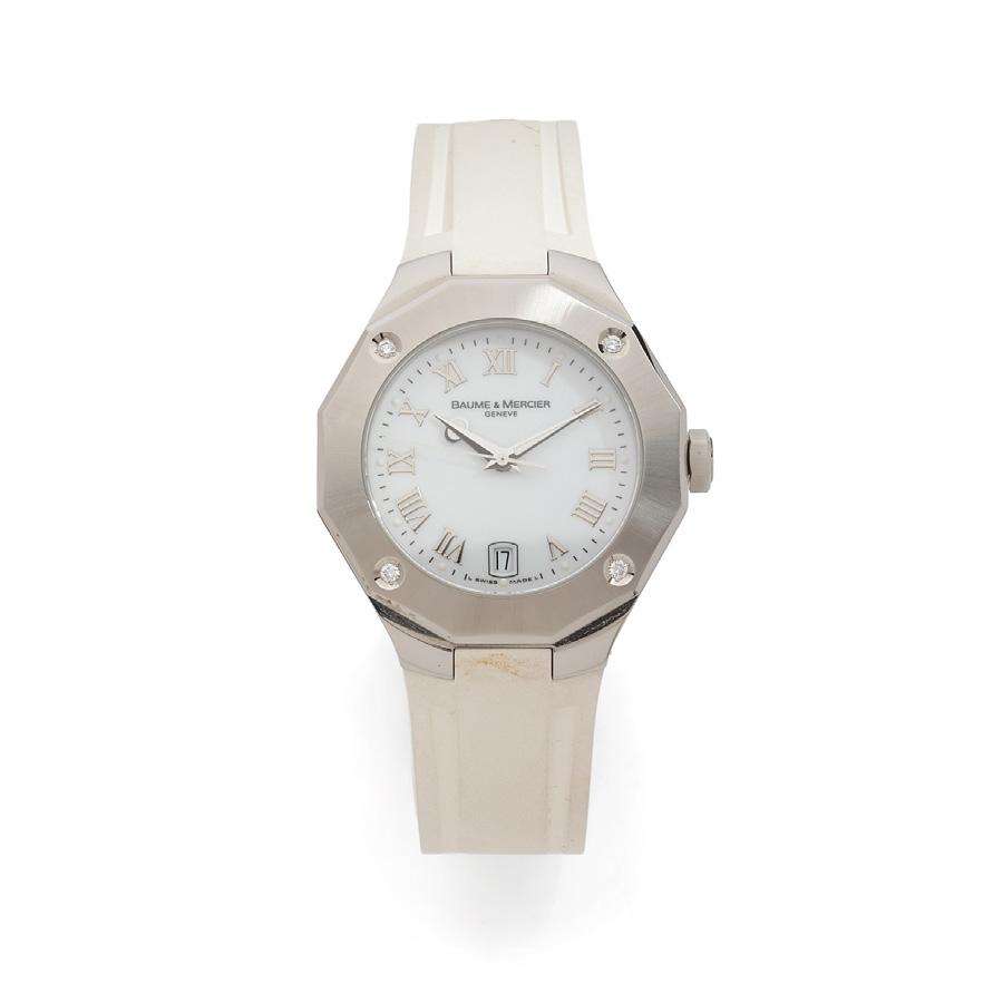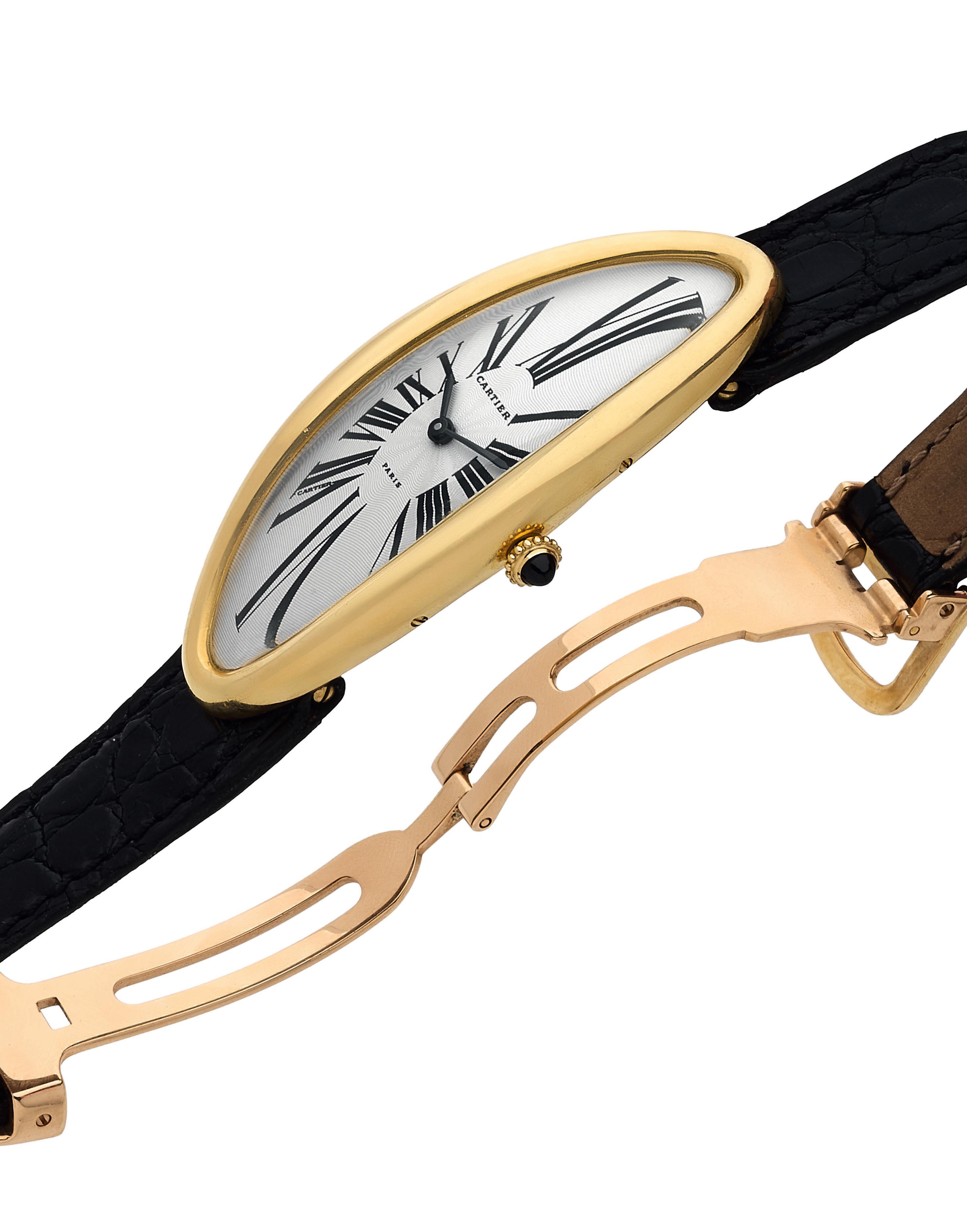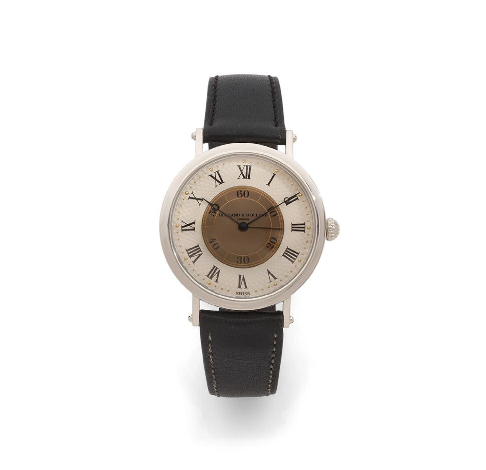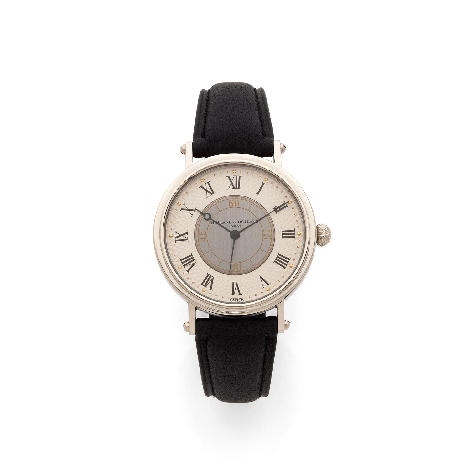 Cadran : blanc, index chiffres romains appliqués, aiguilles feuilles, signé