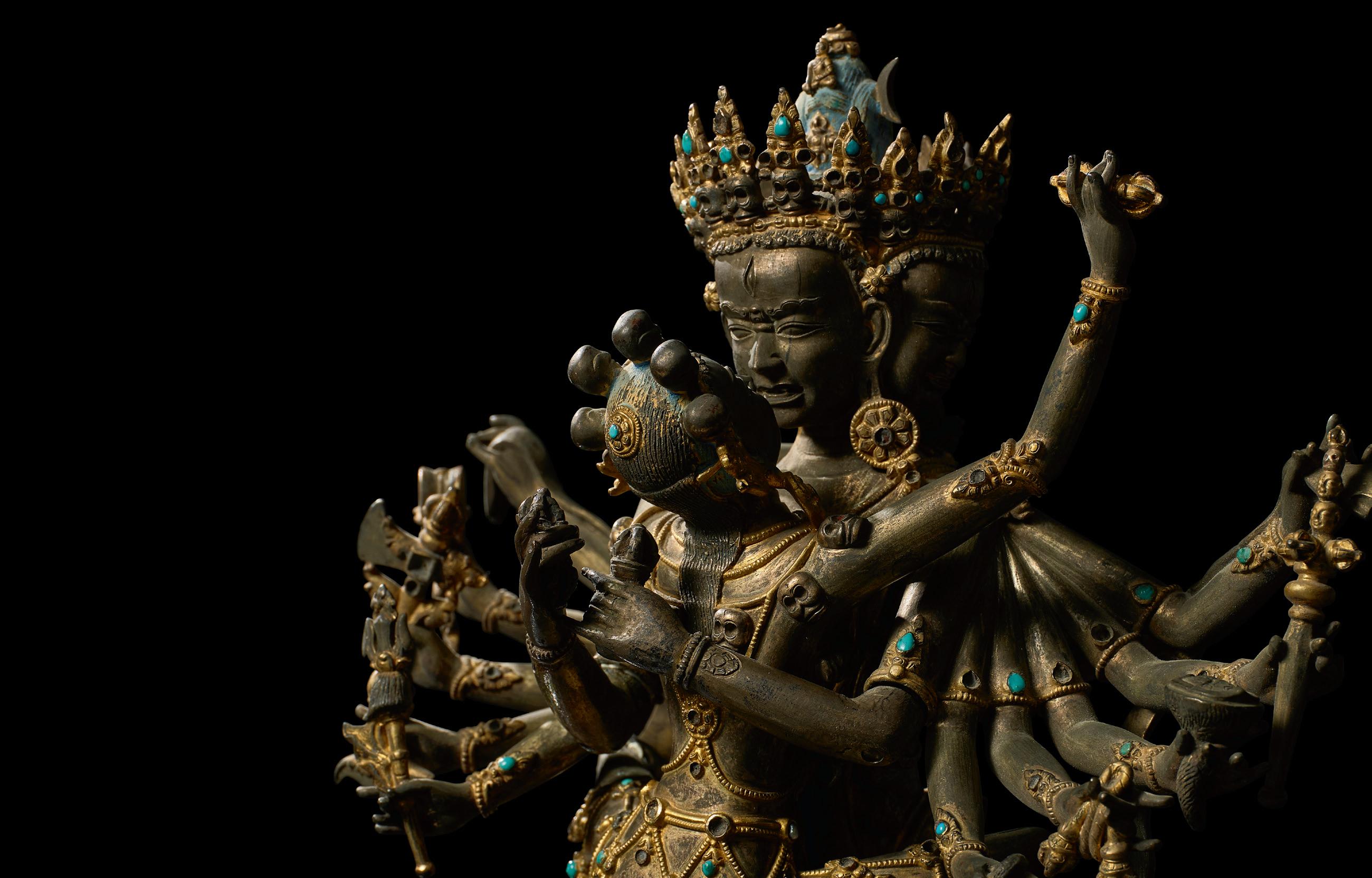 Importante statue de Chakrasamvara en bronze doré, figuré debout en alidhasana (détail) En vente le 2 décembre