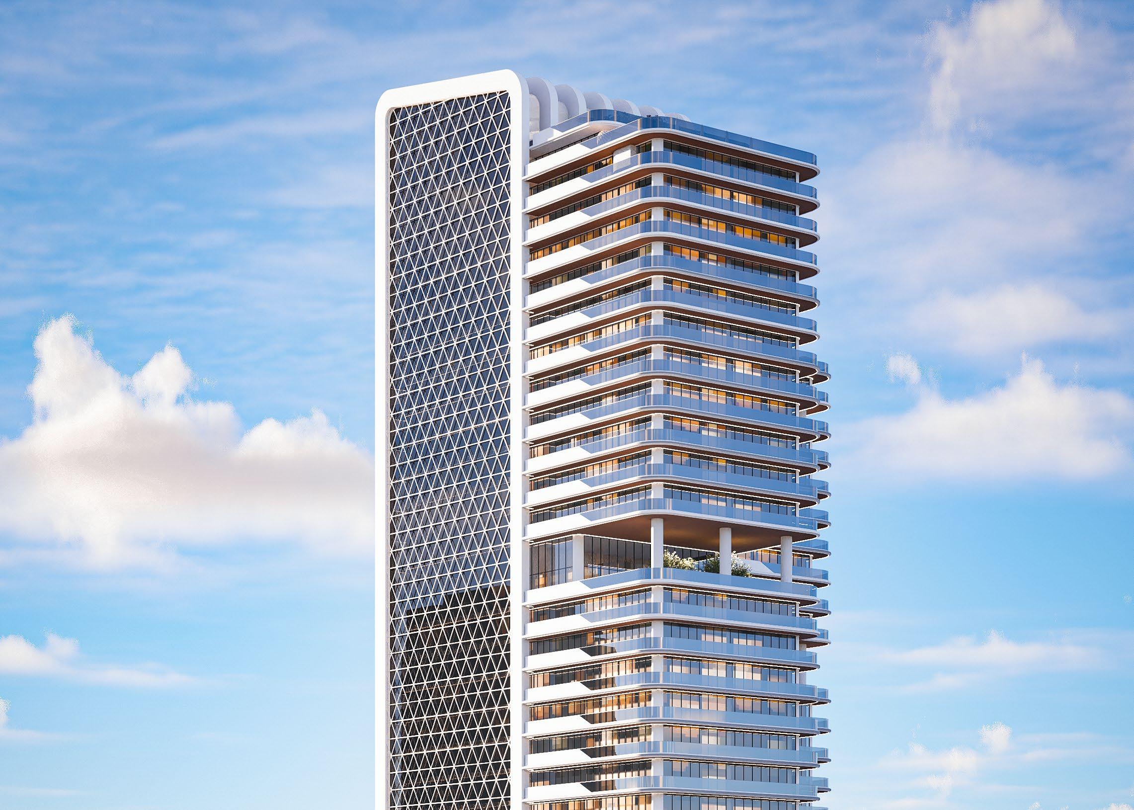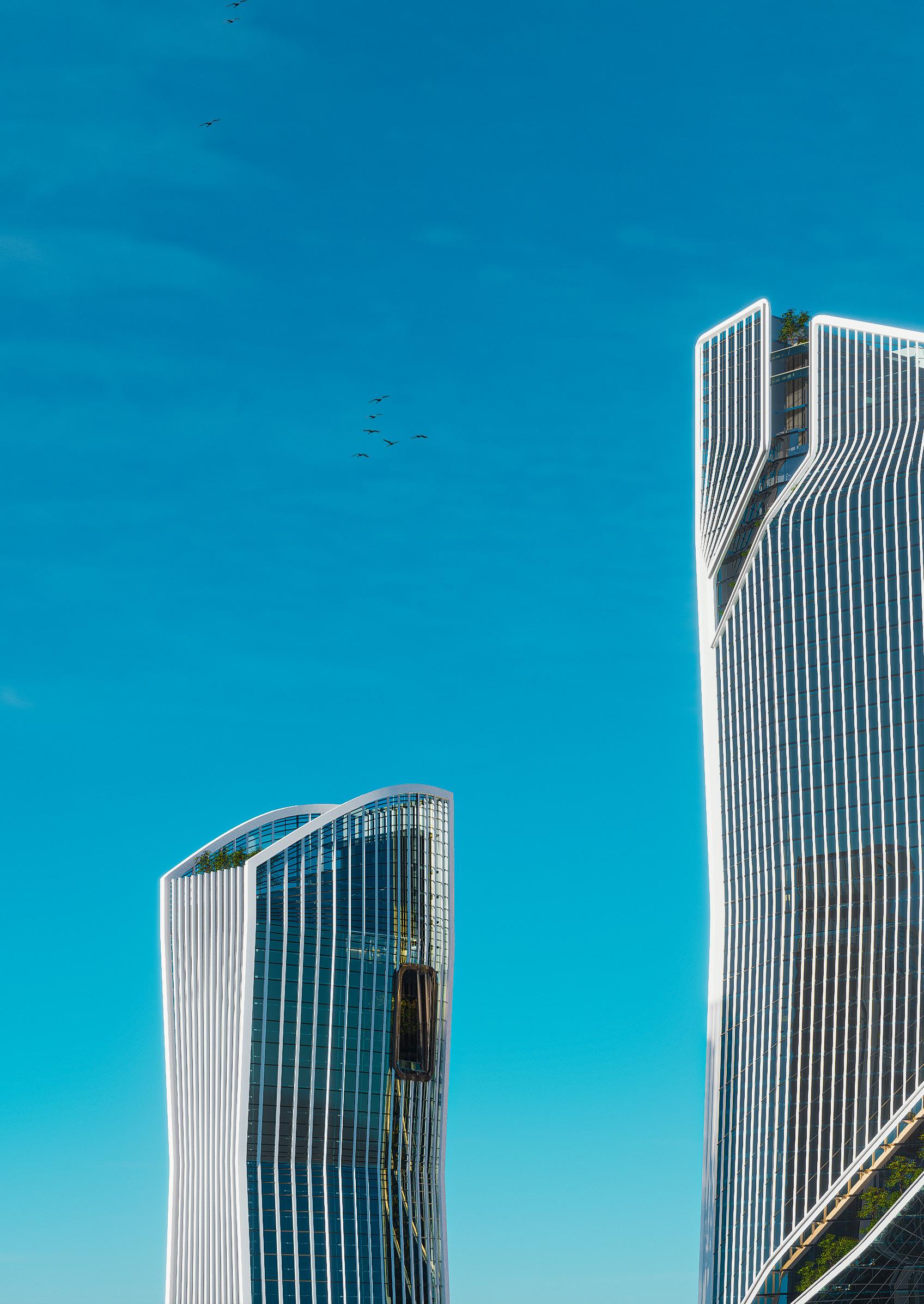 The exterior of the complex is sleek and sophisticated, with a mix of glass, steel, and concrete elements. The towers are arranged in a way that maximizes natural light and ventilation, while also providing privacy for residents. The design features clean lines and a minimalist aesthetic, creating a sense of understated elegance and luxury.