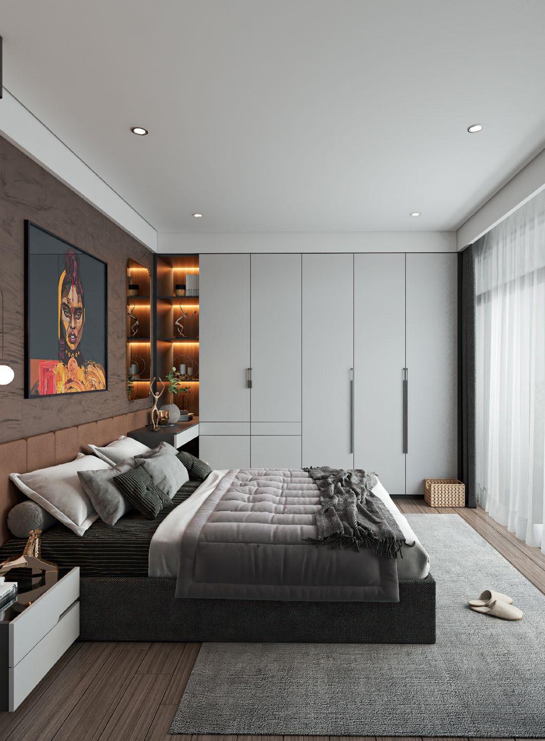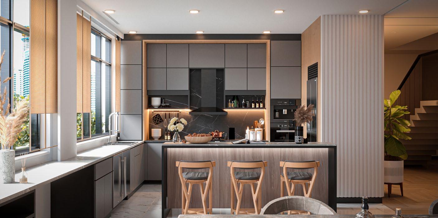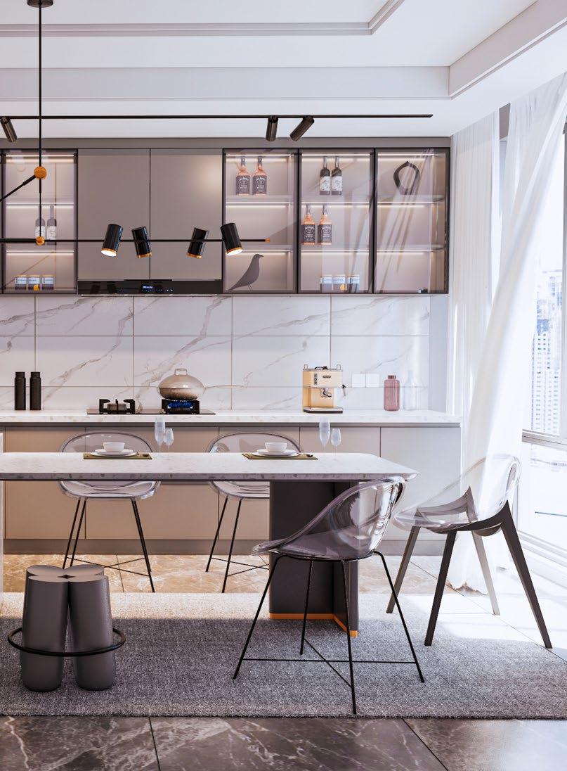 The interior design of the apartment with a luxurious modern aesthetic is a stunning example of elegance and comfort. The warm ascent colors and warm lighting used in the design create a sense of coziness and intimacy, while the sleek and sophisticated finishes and fixtures provide a sense of luxury and sophistication. The kitchen is designed to be both functional and beautiful, with high-end appliances and finishes that make cooking a pleasure. The cabinets and counter-tops feature sleek and modern finishes, while the warm lighting creates a welcoming and inviting atmosphere. A cozy breakfast nook provides the perfect place to start the day, with plenty of natural light and stunning views.