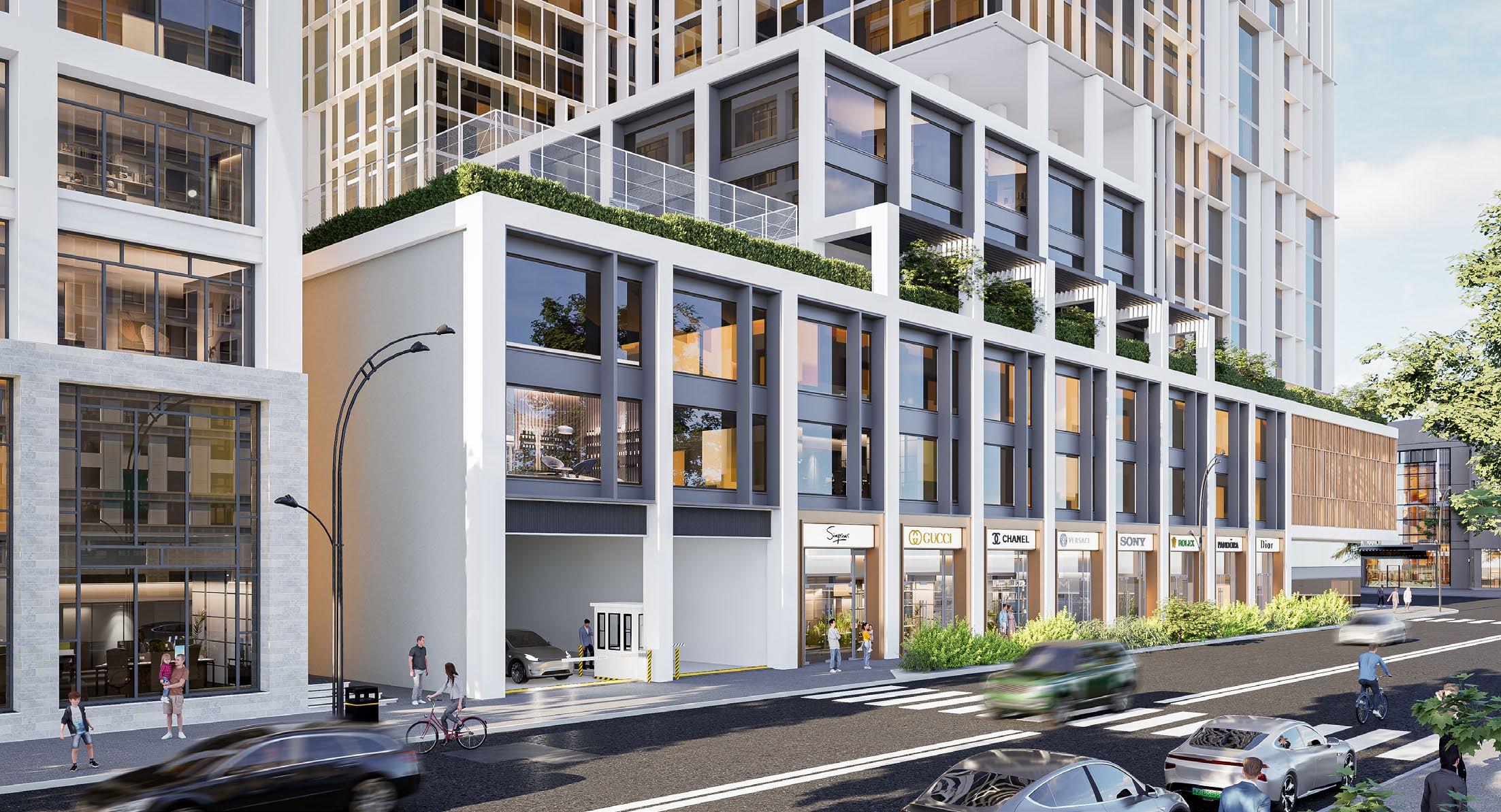 The building is anchored by a commercially rich podium, which houses a range of shops, restaurants, and other amenities. The podium is designed to be both functional and visually appealing, with a mix of materials and textures that create a sense of vibrancy and energy.