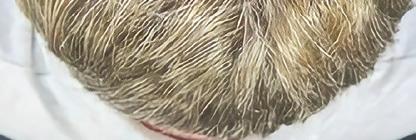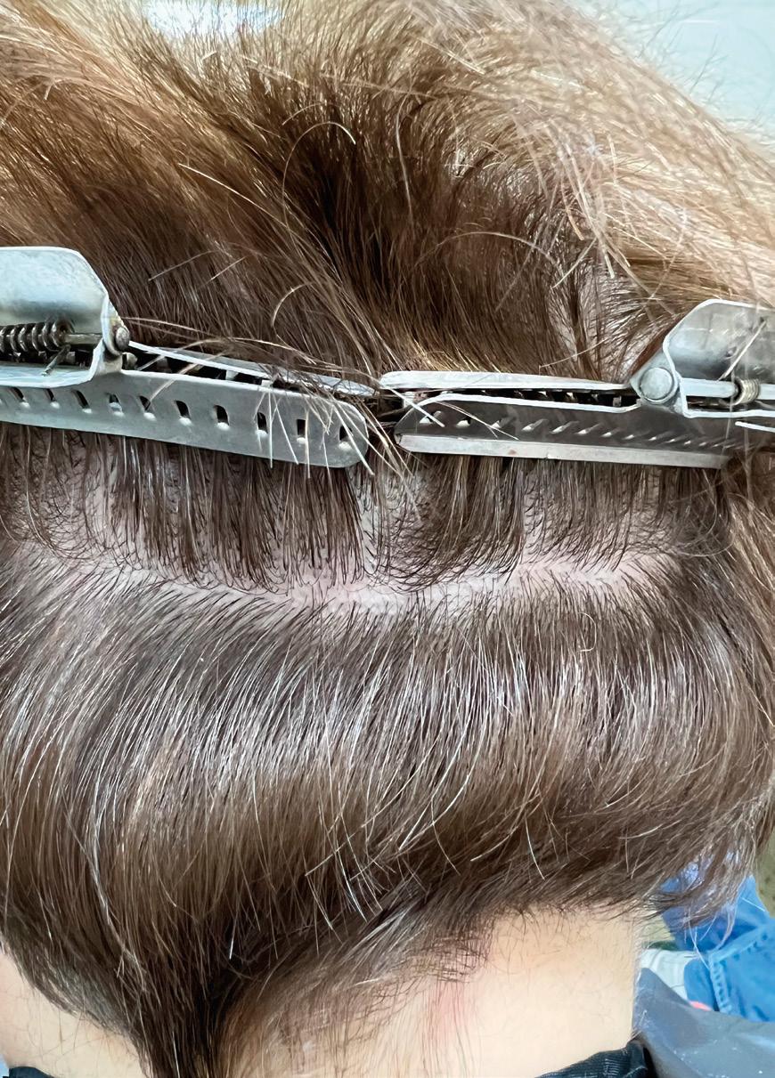 This is a typical suture line on the back of the head. The first procedure was done 3 years ago. When closed as described in my paper the scar is virtually undetectable. is the donor site with the hair clipped showing the scar from the first procedure.