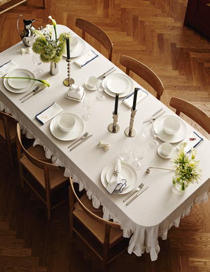 Duka inför nyår med böljande volangduk, broderade servetter och krispigt vitt porslin med diskret rosettdekor. Skapa kontrast med silvriga metaller och matcha glas efter dryckesmenyn.
