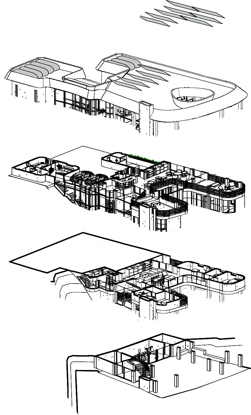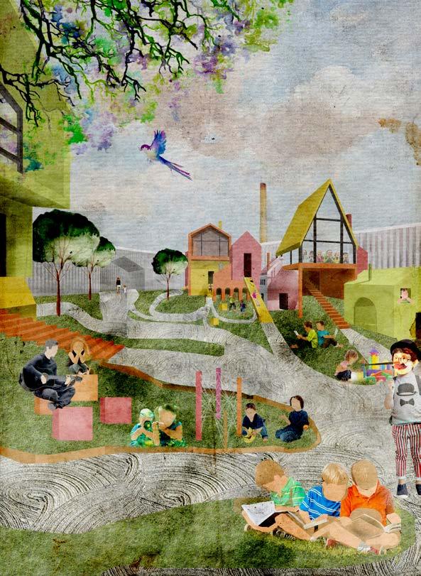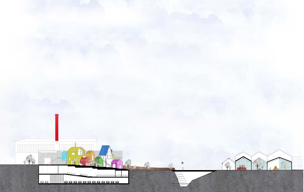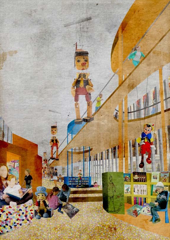 The exis�ng Pinocchio's park is not in direct touch with the city of Collodi. Both look more isolated than connected. The paper factory has the main element that has all the main characteris�cs of its iden�ty, removing the unnecessary added elements could be more helpful than saving them. This primary volume is the key in propor�ons of design. The Church of Collodi is one of the other significant building in the surrounding context. This church has a plaza in front as most of the italian churches, but this one is a bit forgo�en and became a parking place for the cars. The interven�on connects the church's plaza to the Pinocchio's Park through the library and its landscape. This helps to make the city of Collodi as live as possible, by not isola�ng it.