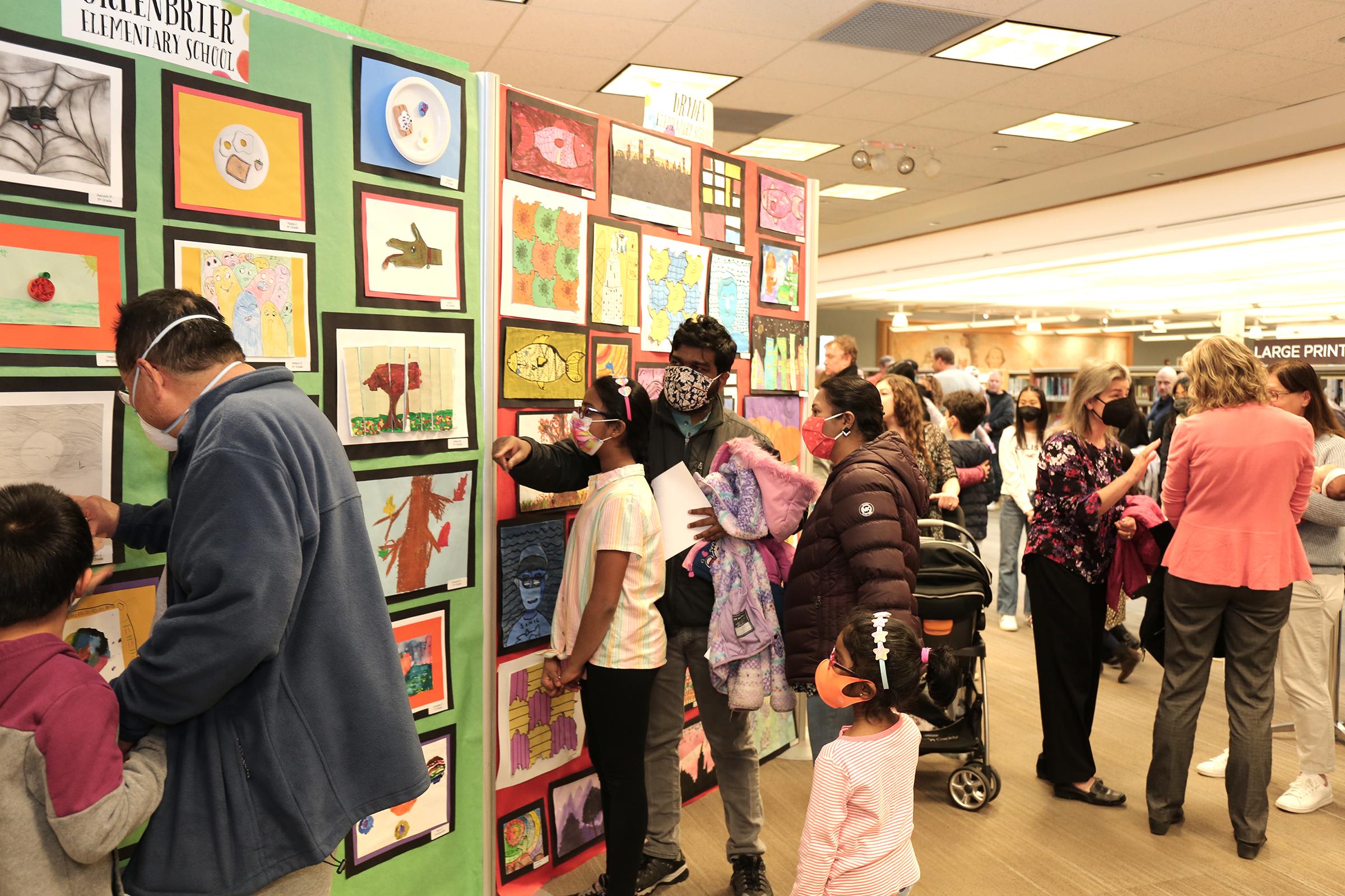 Student artwork from seven District 25 elementary schools and two middle schools returned in-person for the May 2022 Spring Art Show. The exhibit was visited by approximately 4,800 art lovers of all ages. Just over 600 students and families celebrated the student artists at two opening receptions. Visitors admired the art, took pictures with District 25 art teachers and were happy to see the library bring back the annual event.