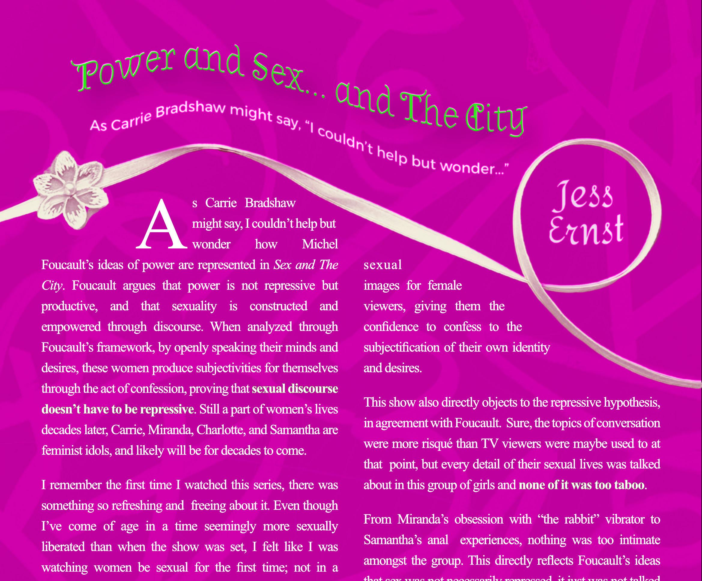 thatsexwasnotnecessarilyrepressed,itjustwasnottalked about as openly. But, the more discourse that’s created, the morenormalizeditbecomes.Thisshowcreatedadiscursive explosion about women’s sexuality at the turn of the century, and I believe changed, or at least started conversations, about women taking back the power in their own sexuality—something that has continued to impactwomen27yearsafteritsrelease.