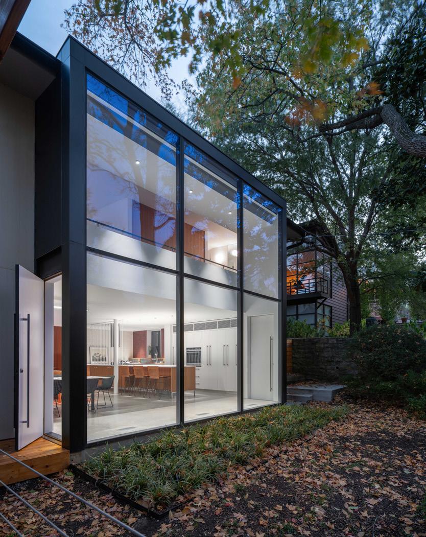 Located in the Westside neighborhood of Kansas City, the bold design of this high-end contemporary home reflects its urban setting while also being conscious of its environment, with features such as extensive natural light throughout the home and an untouched natural rock ledge that the home is built into. Expansive floor-to-ceiling windows allow light to be used creatively to direct the flow of space. The design allows for a connection between the interior and exteriors, with a private courtyard and views from the library to maximize a deep appreciation for the landscape surrounding the home.