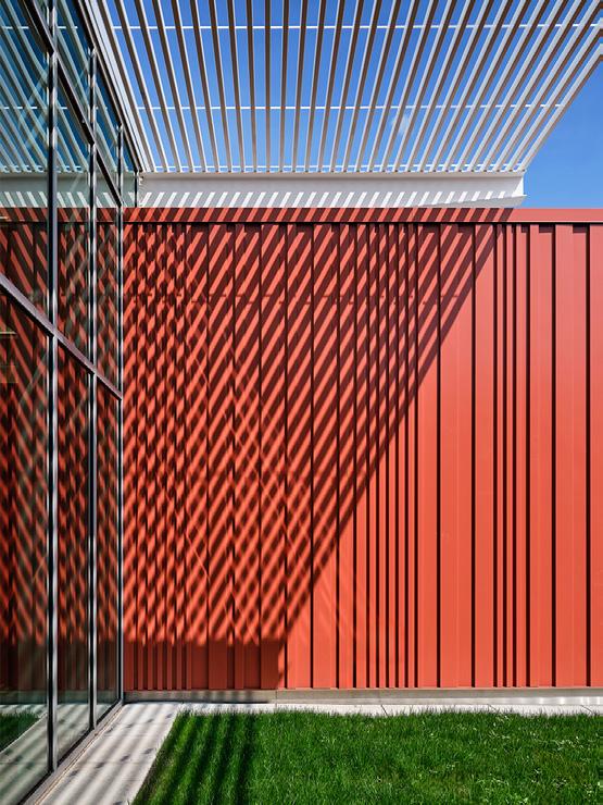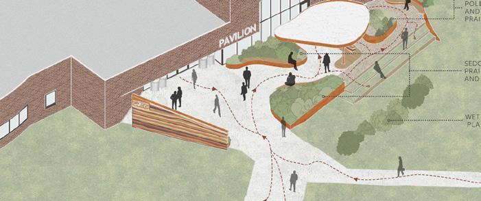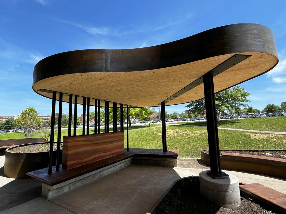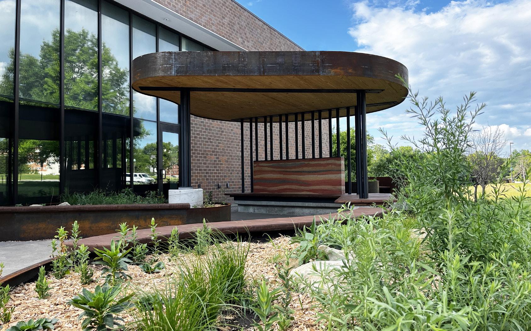 The garden features five curvilinear weathering steel raised planters, ascending across the site. A central cross - laminated timber canopy shelters a rammed earth wall and timber benches. The planting design highlights native prairie species chosen for resilience, ecological value, and seasonal beauty. Together, these elements create a contemplative, nature-rich space for gathering, reflection, and connection.