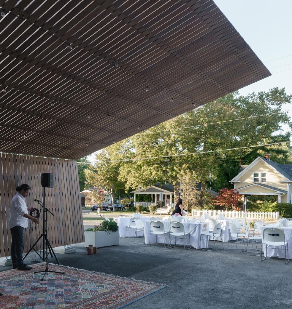 A sculptural trellis designed, fabricated, and installed by the architect transforms a parking lot at InterUrban ArtHouse into a vibrant performance and event space. Providing shade, identity, and revenue potential, the project also served as a hands-on training opportunity for emerging designers under close professional mentorship.