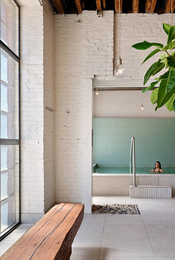 KLA Sanctuary blends historic charm with modern design, featuring terracotta and original brick, warm plaster walls, and exposed wood joists. This serene spa offers pools, showers, and therapy rooms in a sustainable setting. Every detail reflects craftsmanship, creating a timeless space for relaxation, rejuvenation, and holistic escape.