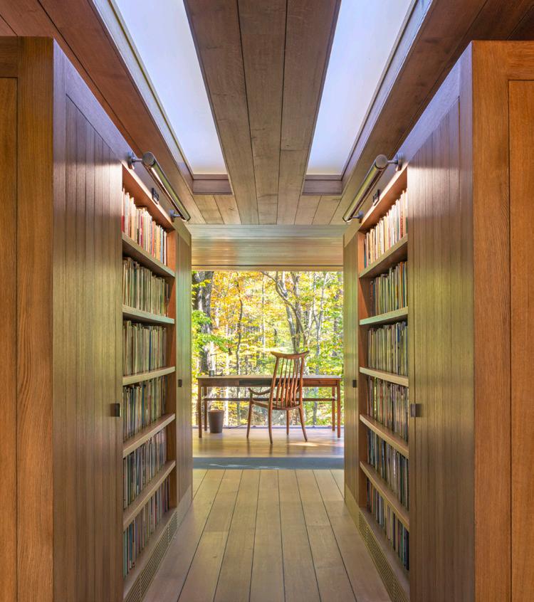 Intimate, welcoming, and rightsized – the building is only 400 sf of conditioned space. Systems are concealed with an eye towards sustainability, electrical services buried, a well for water, an incinerating toilet eliminating the need for septic, and ground source geothermal provides proper conditioning to preserve a 1700 volume collection of poetry.