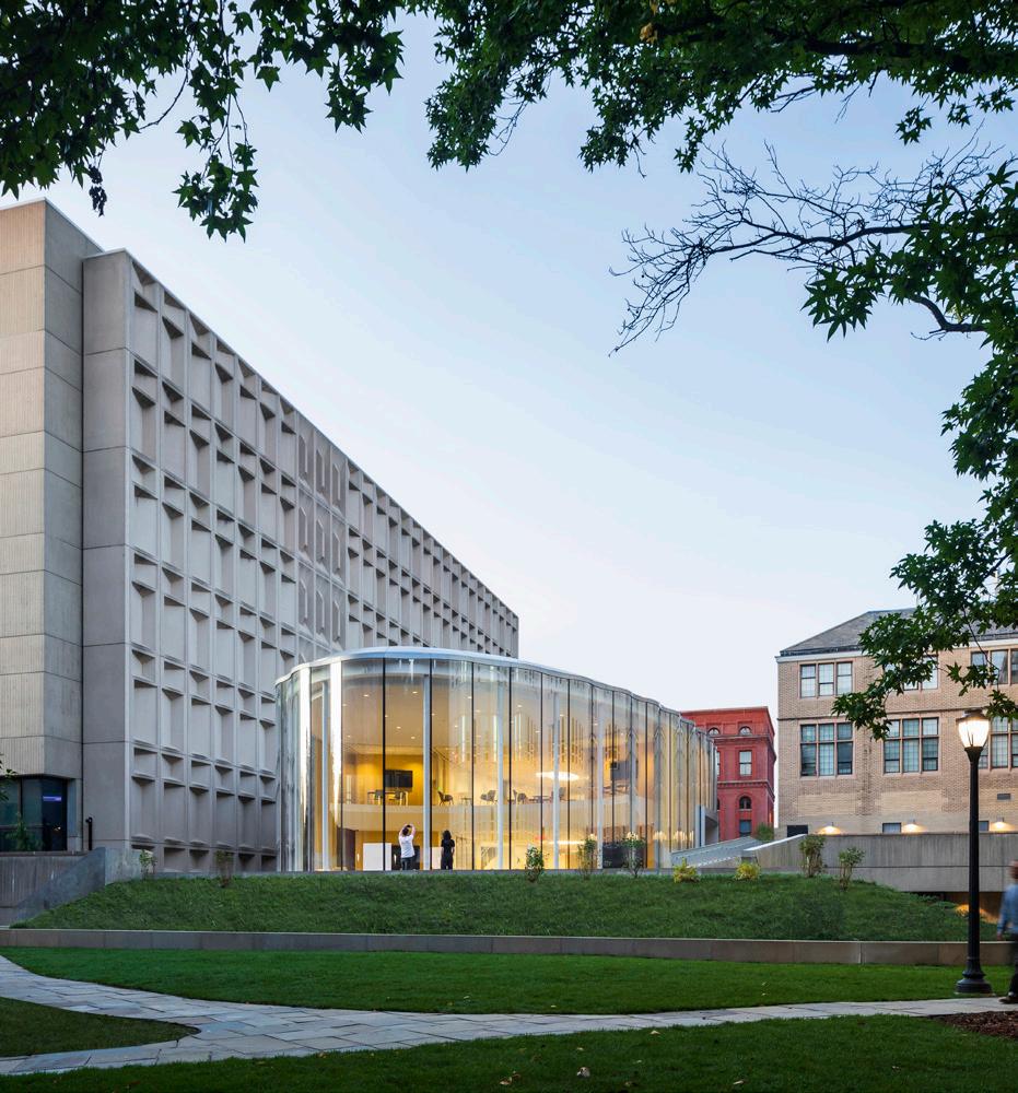 Within the center, continuous sightlines throughout unite spaces of creation and critique, encouraging interdisciplinary discourse. The open studio, conference and breakout spaces create opportunities for spontaneous discussion and provide a link between public areas and adjacent instructional spaces. In keeping with Yale’s commitment to sustainability, the project replaces the current underused paved plaza with a new planted garden, significantly reducing storm runoff and encouraging activity year-round. The building and the plaza renovation have received LEED gold certification.