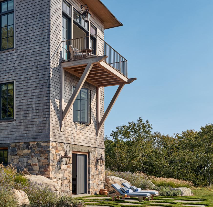 Pointer Perch is more than just a house; it’s a retreat designed to enhance the connection between its inhabitants and the surrounding natural environment. The owners requested a house which would provide just what was needed for a couple and their dog, and nothing more. The house was to be a low maintenance, sustainable retreat, with just a few generously sized rooms positioned to capture the panoramic ocean views. The tower form of the house raises the living spaces above the surrounding trees, capturing the ocean views. The compact form contributes to the home’s sustainability and has a minimal impact on the natural landscape. The exterior materials were selected for their low maintenance and durability in the harsh maritime environment. The solution of a tower-inspired house addressed the basic design problem of creating a very small, compact house which would have the height to capitalize on the views above the neighboring woodlands. The architectural style of the home reflects the island’s eclectic shingled cottages, reinterpreted in a contemporary dynamic form. The natural cedar cladding weathers to a soft grey, allowing the house to blend with the surrounding woodlands.