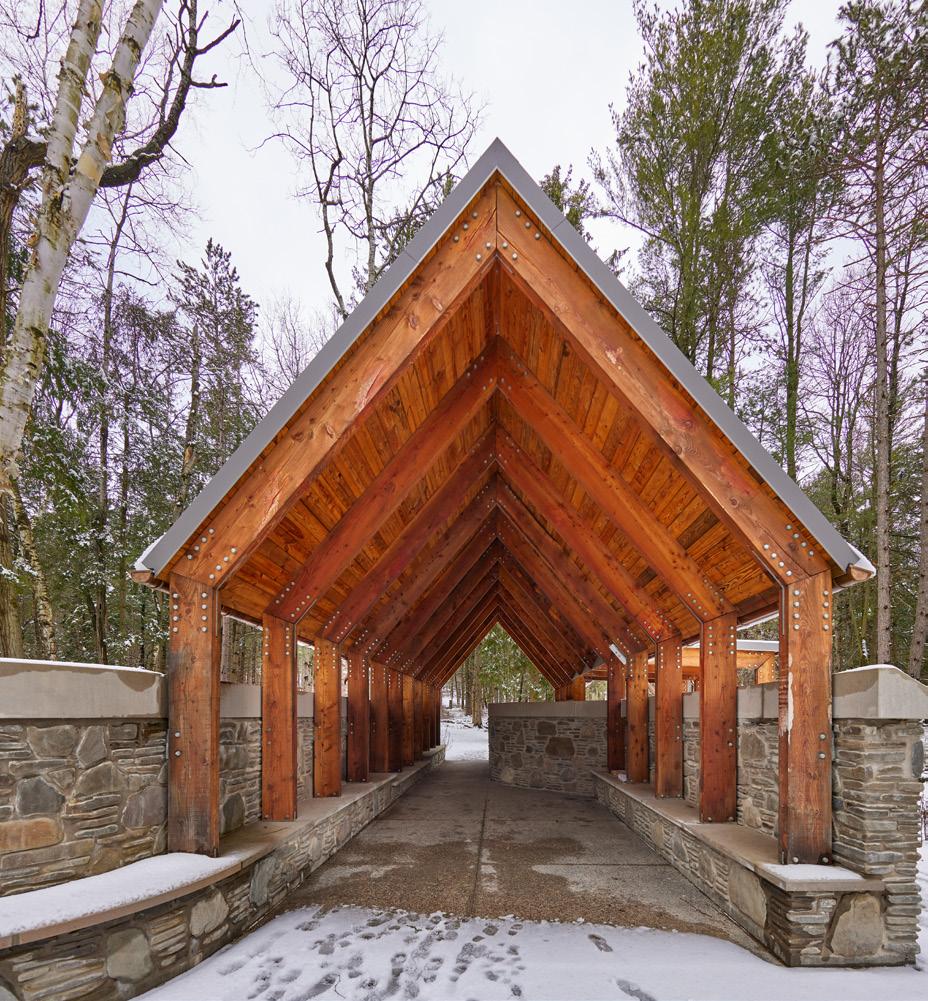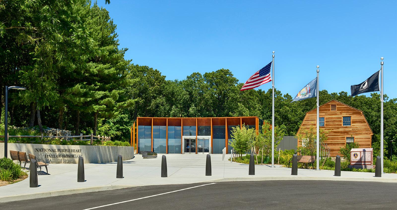 The National Purple Heart Hall of Honor is a 12,000-square-foot museum and visitor center for honoring the valor and sacrifice of the recipients of the Purple Heart Medal. The United States Purple Heart Medal is given to military service women and men who courageously gave of themselves in conflict. Sitting on the slope of Temple Hill in New Windsor, New York, the site where General George Washington established the Badge of Merit—the precursor to the Purple Heart—for valorous efforts during the American Revolution, the Hall of Honor is conceived as a modern temple integrated into the rustic landscape. Inspired by the 18th-century rough-hewn log cabins set into the wooded hillside of Washington’s historic cantonment, the Hall of Honor is sited to announce its presence from the road with the historic cantonment as its background. A one-story sculpted arcuated portal addresses the visitors’ approach from the road resulting in a civic memorial that is appropriately scaled for this delicate historic landscape. A welcoming promenade negotiates a steeply sloping site from parking and is lined with five granite benches dedicated to each branch of military service. Internally, exhibit and gathering spaces focus visitor views out to the landscape to connect them with Washington’s cantonment. An exterior contemplative garden houses an eternal flame for all Purple Heart recipients, and an outdoor reflection terrace overlooks the nearby Catskill Mountains. Externally, weathered carbon steel provides a color and texture for the museum that complement the deep russet colors of the historic log cabins that surround this sloping wooded site, thereby feeling both a part of and distinguished from its historic context.