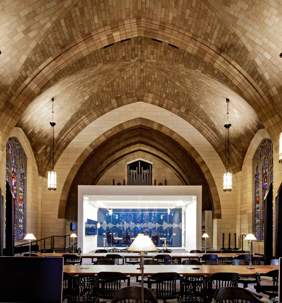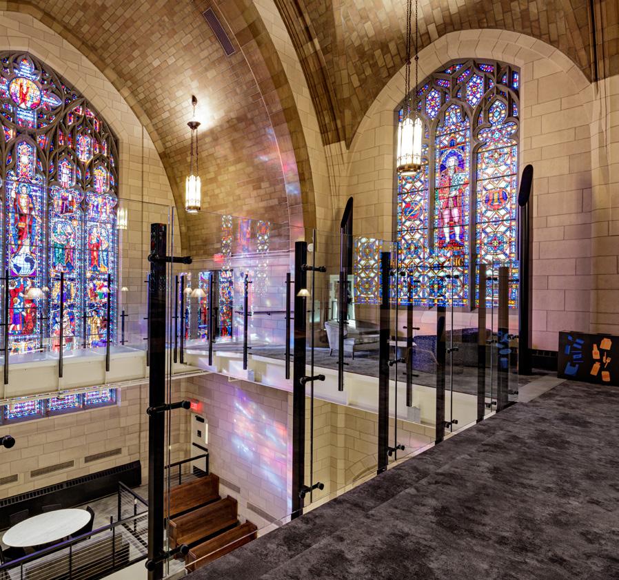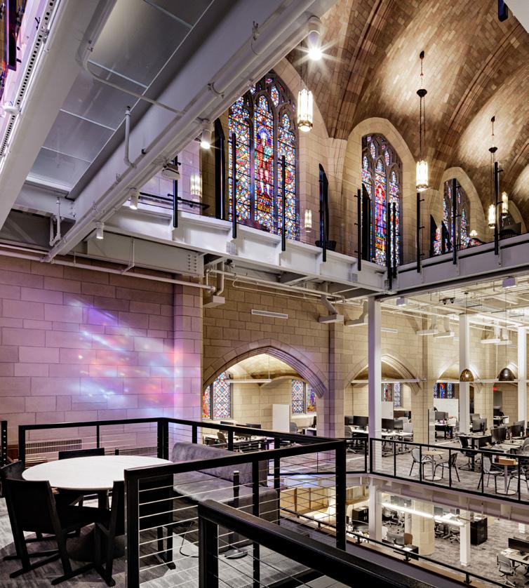The Architect meticulously restored the spaces, co-joining the three buildings through a creative design approach. A new three-story freestanding endoskeleton of platforms, interconnected stairs, and a glass bridge was introduced, offering up-close views of the cathedral’s groin vaults and stained glass windows, which were subtly modified to remove overtly religious references, fostering a more inclusive workplace.