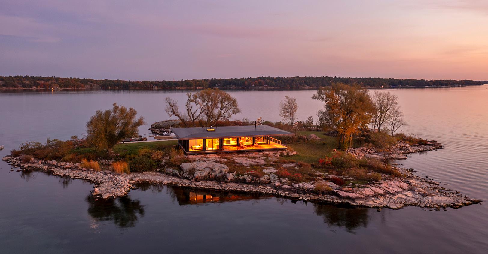 The team was tasked with designing a highly contemporary steel and glass house on a private island in the Thousand Islands. The clients desired an “off-the-grid” residence, accessible year-round, featuring an essentially flat roof system.