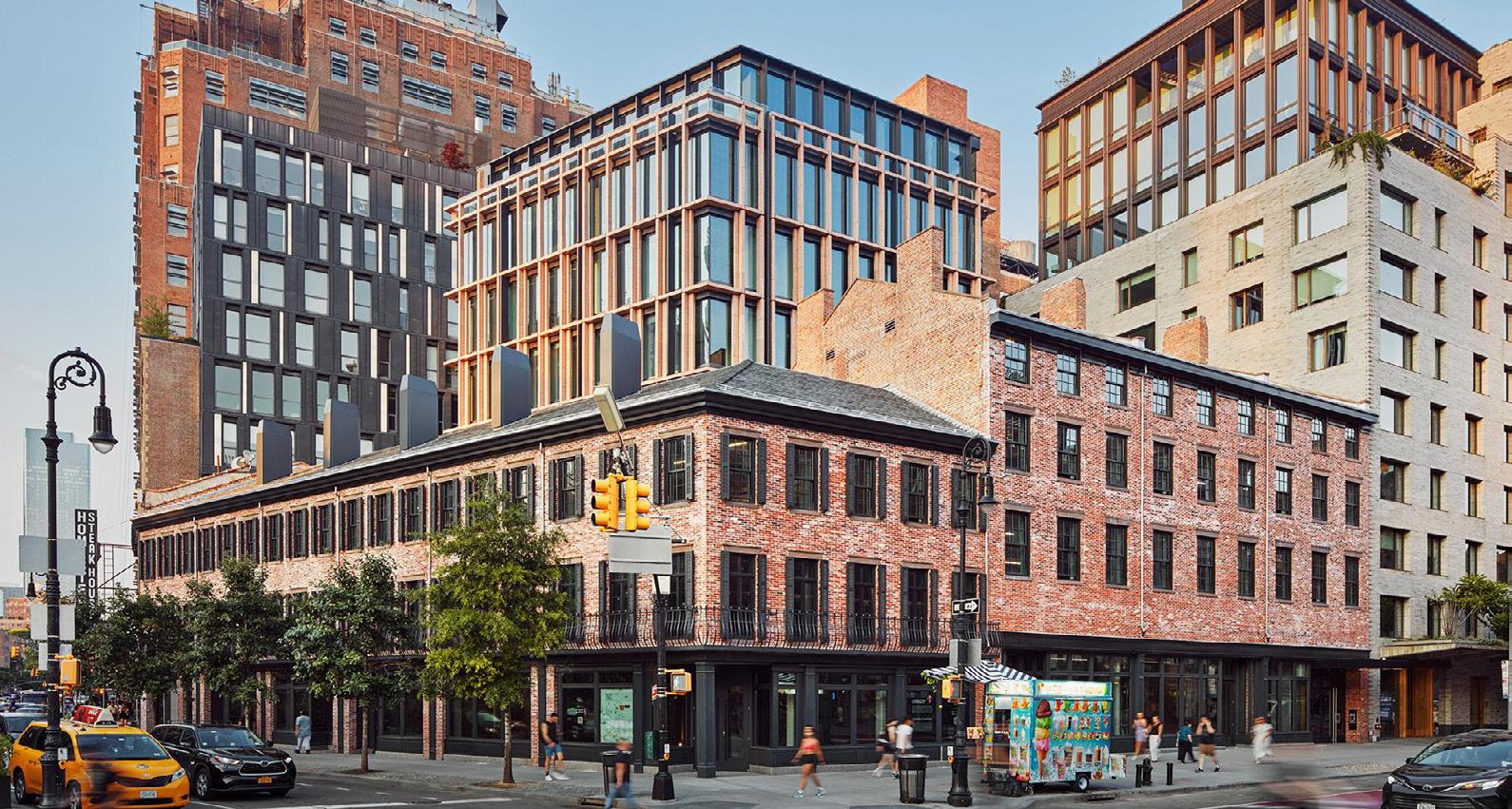 50 Ninth, is a nine-story commercial renovation and expansion at the intersection of three New York City neighborhoods – Chelsea, the Meatpacking District, and the West Village. It includes a substantial restoration and preservation of two historic buildings and a new infill addition. The addition is set well back of the historic buildings to preserve the presence of their sloped roof volumes in the urban context and complements the materiality of the original brick structures, with a contemporary, exterior terra-cotta frame. The original buildings continue to be used as retail space on the ground floor, with office space now occupying their upper floors.