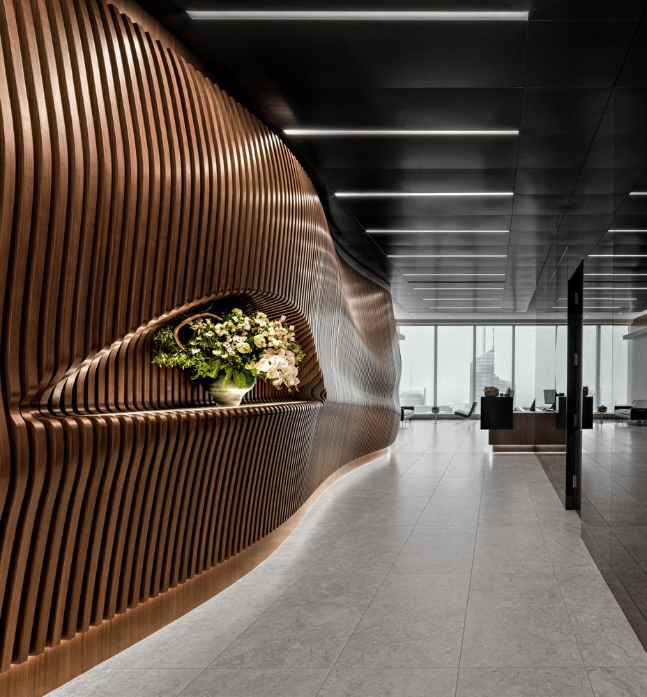 At the core of this cutting-edge design for the financial client’s new headquarters, stands a captivating fin wall—an architectural masterpiece meticulously crafted to infuse dynamism into every aspect of the space, from the entryway to the conference rooms and the barista area. The walls elegantly showcase three-dimensional curves, symbolizing Flex Point’s resolute dedication to pushing boundaries and embracing state-ofthe-art solutions.