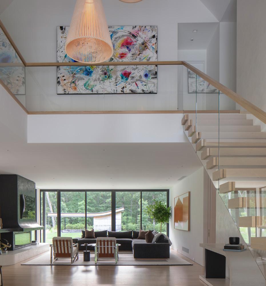 The clients wanted a clear internal structure, with public-facing living spaces on the ground floor and their own separate bedrooms on the second floor, which led to the team coming up with a plan built on the idea of rotational symmetry. On the second level, three bedrooms—two of which are identical—center around the house’s circulatory spine, a double-height atrium with a subtle staircase. On the ground floor, a modernist glass box feels like it’s floating on the wooded site, bringing a moment of clarity and a connection to the outdoors.