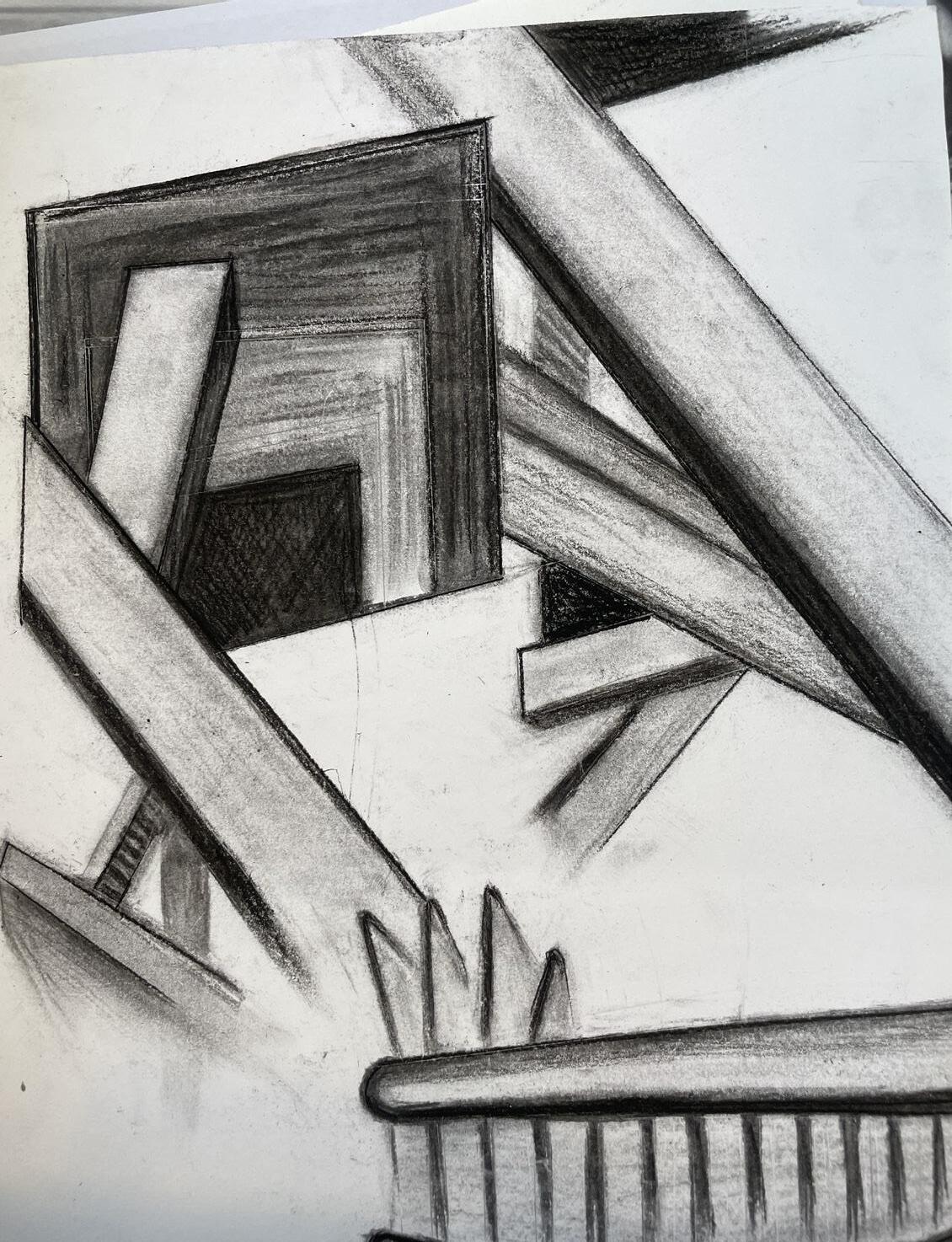 this, however, I looked at overall human form and being - how characterisation of my characters reflects bodies, movement and interaction. Inspired by Paul P. I explored human shape and appearance via different lighting, pose and setting - I represented his atmospheric and ‘exposed’ art of the body; my artworks similarly explored naked and clothed skin, tone and ‘queer’ or anomalous appearances. I found it interesting how shapes can be presented with distortion or warping and the effect this achieves: for example, the human body and face which can be shown with unnatural angles and communicative features, such as line - crossing out the shape, lining it up, or restricting it. Through this I wanted to open a line of communication with their viewer so that their interpretations can be directed and influenced with my intended structure.