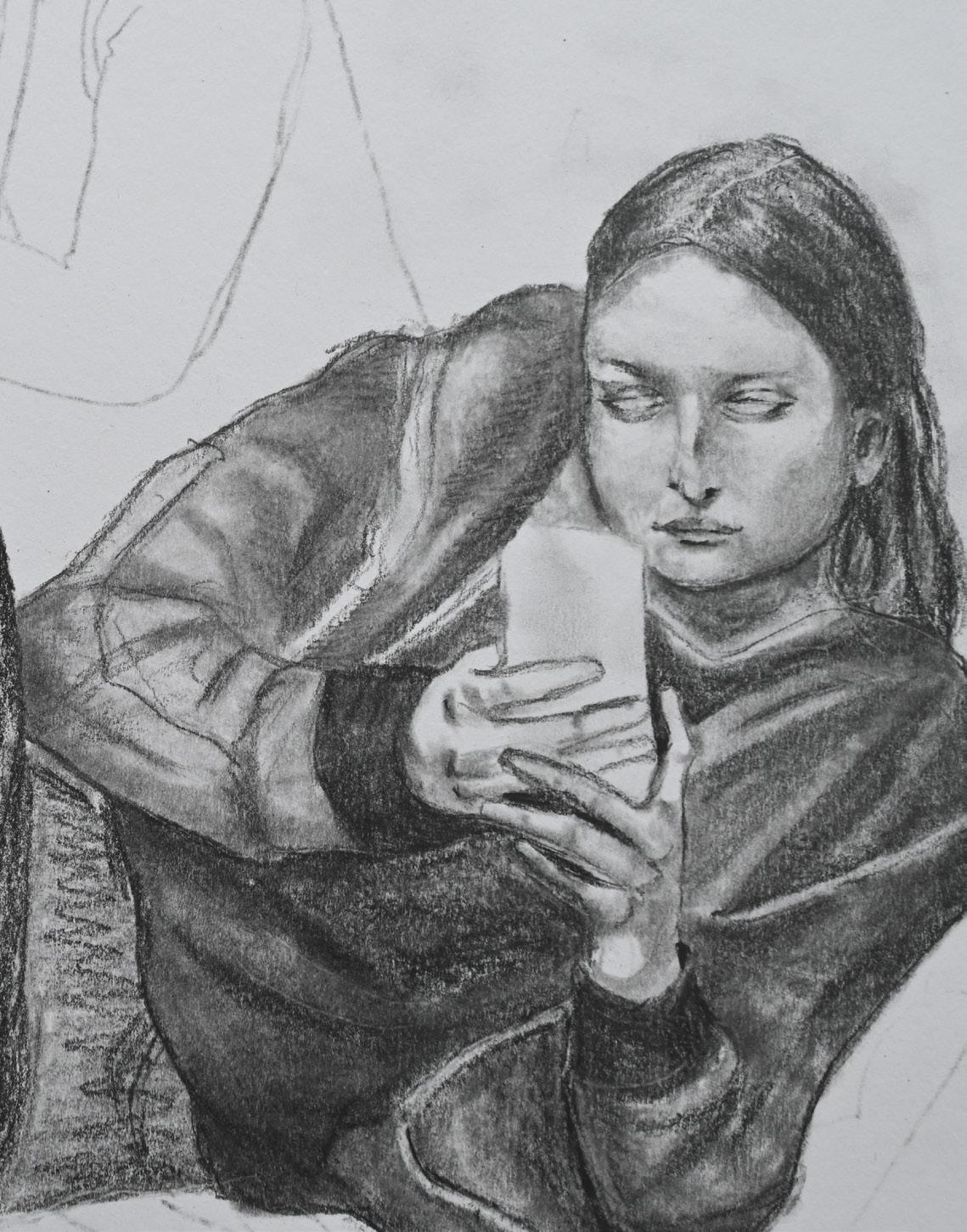 All of my pieces are seamlessly connected, not only by their thought-provoking examination of the human condition, but also by their subjects: they each feature a human. The slowdrying time and blendable quality of oil paints enables me to realistically capture the subtle nuances of skin tones and produce near-naturalistic human depictions of human faces. My body of work may also be connected by the frequent inclusion of a vibrant, saturated colour palette, reminiscent of a child’s playroom. The exception to this is my graphite pencil piece, entitled “Birth”, which challenges the traditional view that birth is solely a physical occurrence by showcasing a mature woman undergoing a spiritual rebirth. Despite its absence of eyecatching colour, this piece is conspicuous in my body of work; its
