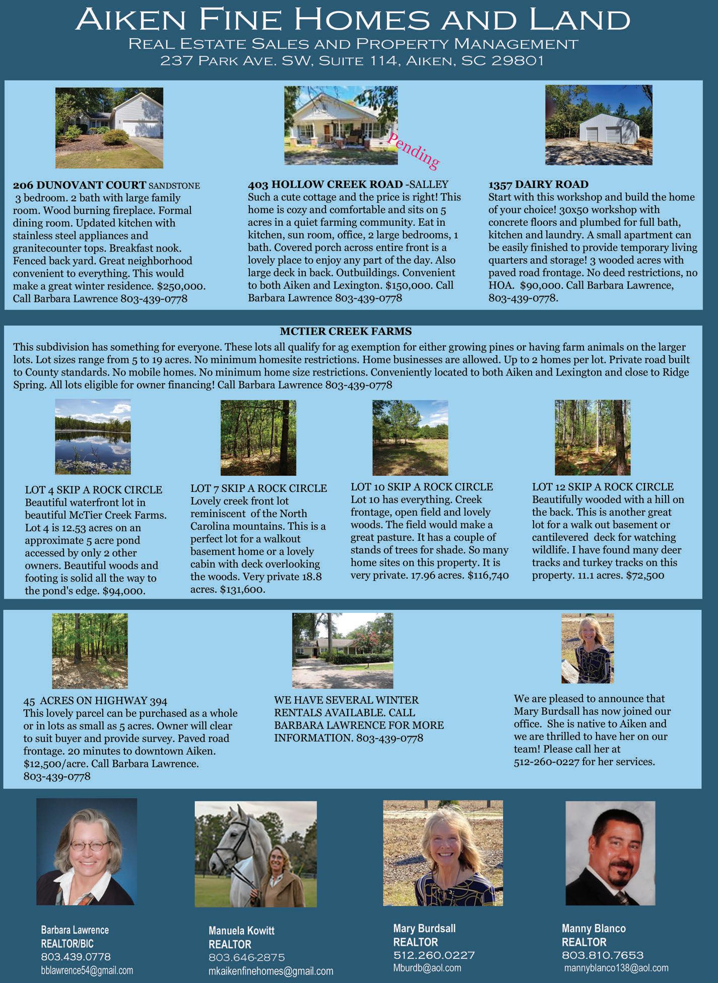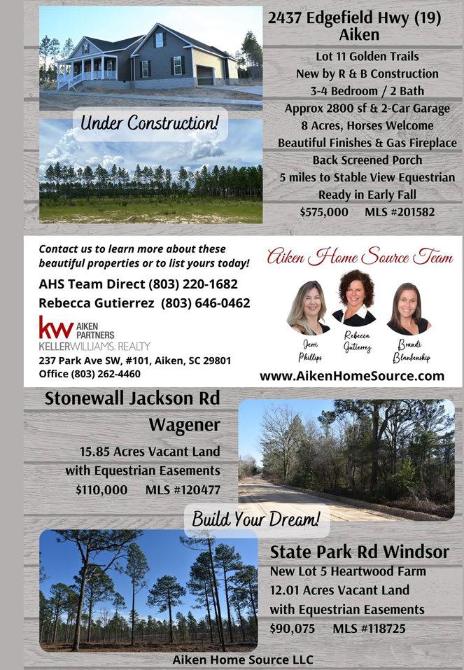 ALEX TYRTEOS 203.249.3071 | $225,000 Great opportunity to buy a 10 acre lot ready for construction. Professional plans for both a house and a barn have been prepared and will convey with the property. DHEC septic permit has already been issued. Need to get your place built sooner than later, this is the perfect place! Waterwheel Homestead BARB GOULD USKUP 803.295.3199 | $16,000 Incredible opportunity to own your own piece of heaven at a reasonable price! Wooded acreage with ample paved road frontage includes 3.99 acres of natural beauty for your home or small farmette. Ideally located in Hwy 302 Horse Country surrounded by beautiful horse farms, just 20 minutes to downtown Aiken.