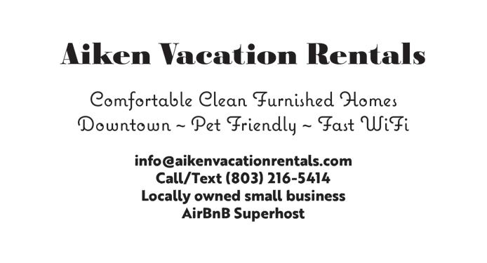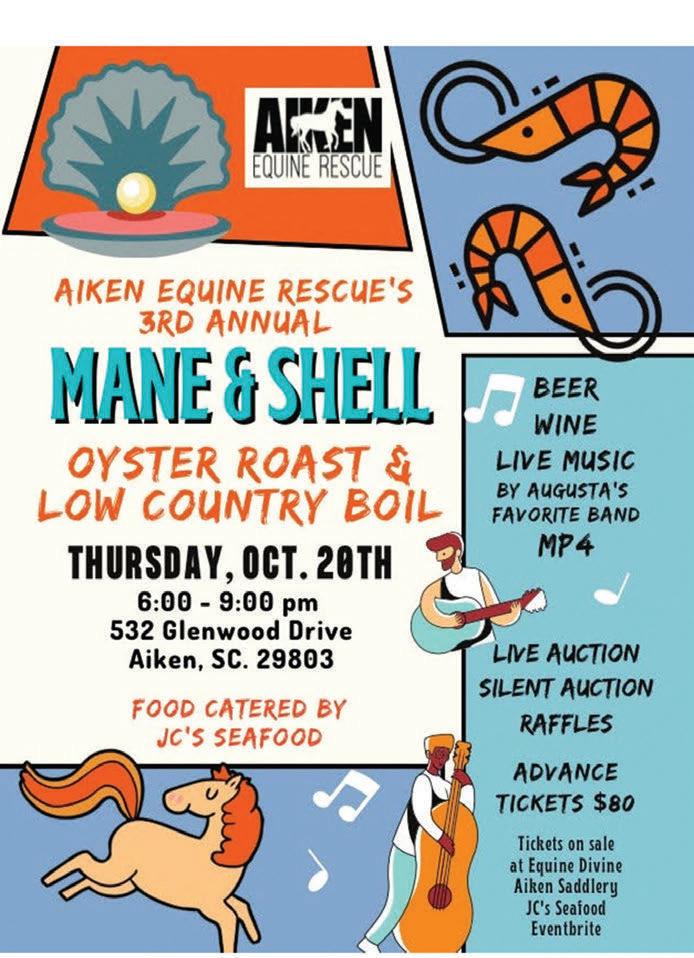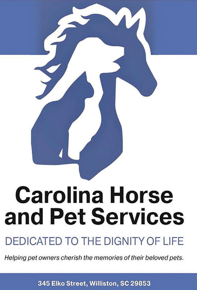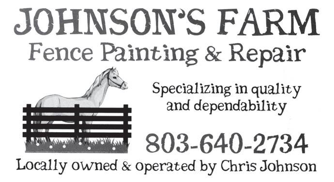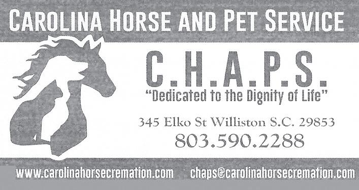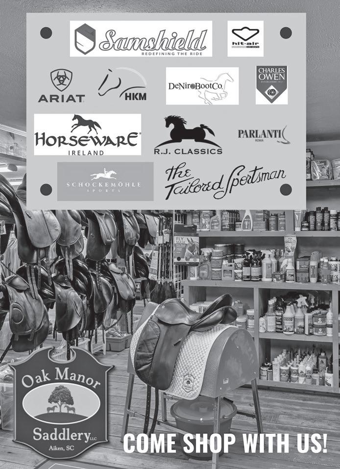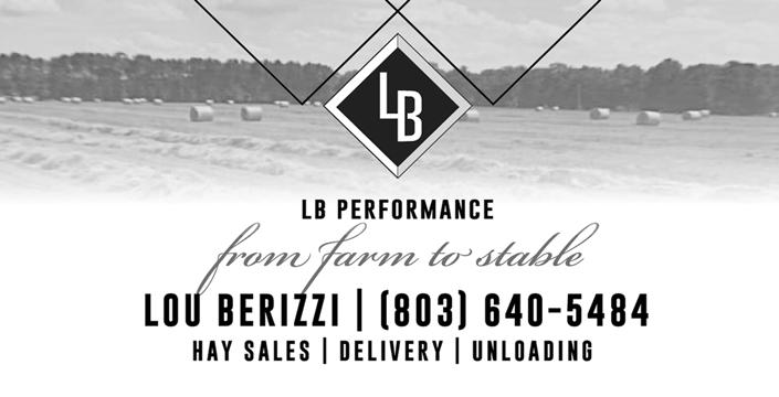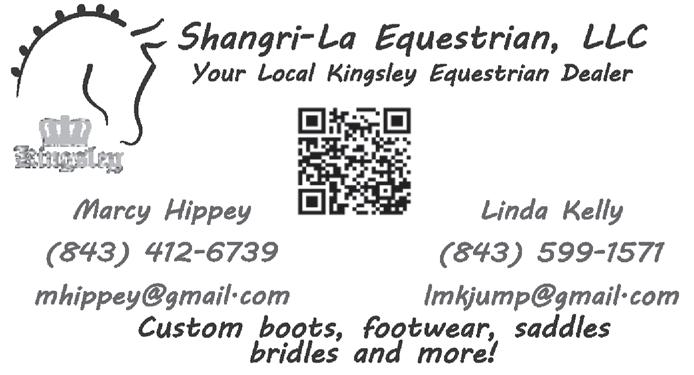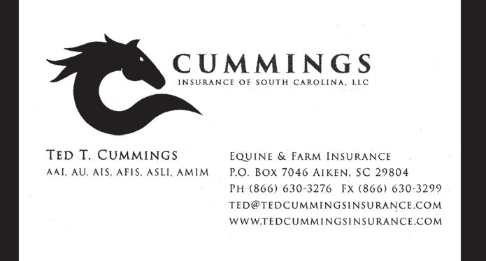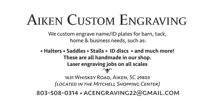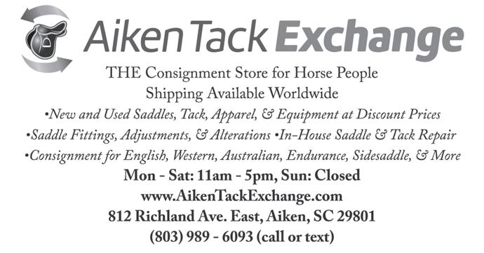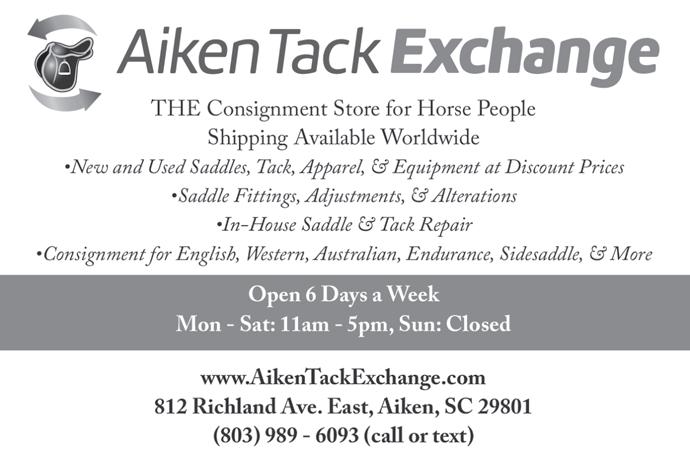 CLASSIFIEDS: add $5 to your total DIRECTORY LISTING ADS: $25 per issue or $90 for the year (6 issues.) BUSINESS CARDS: $70 per issue or $290 for the year (6 issues.) DISPLAY ADS are available in a range of sizes. For a detailed rate sheet and publication schedule, visit our website: TheAikenHorse.com MAILING ADDRESS: The Aiken Horse, P.O. Box 332, Montmorenci, SC 29839 EMAIL: theAikenHorse@gmail.com We accept Visa, Mastercard, Discover and American Express. Pay online: TheAikenHorse.com or call us: 803.643.9960 Advertise in the Dec-Jan issue! Deadline November 17, 2022 Publication date December 3, 2022