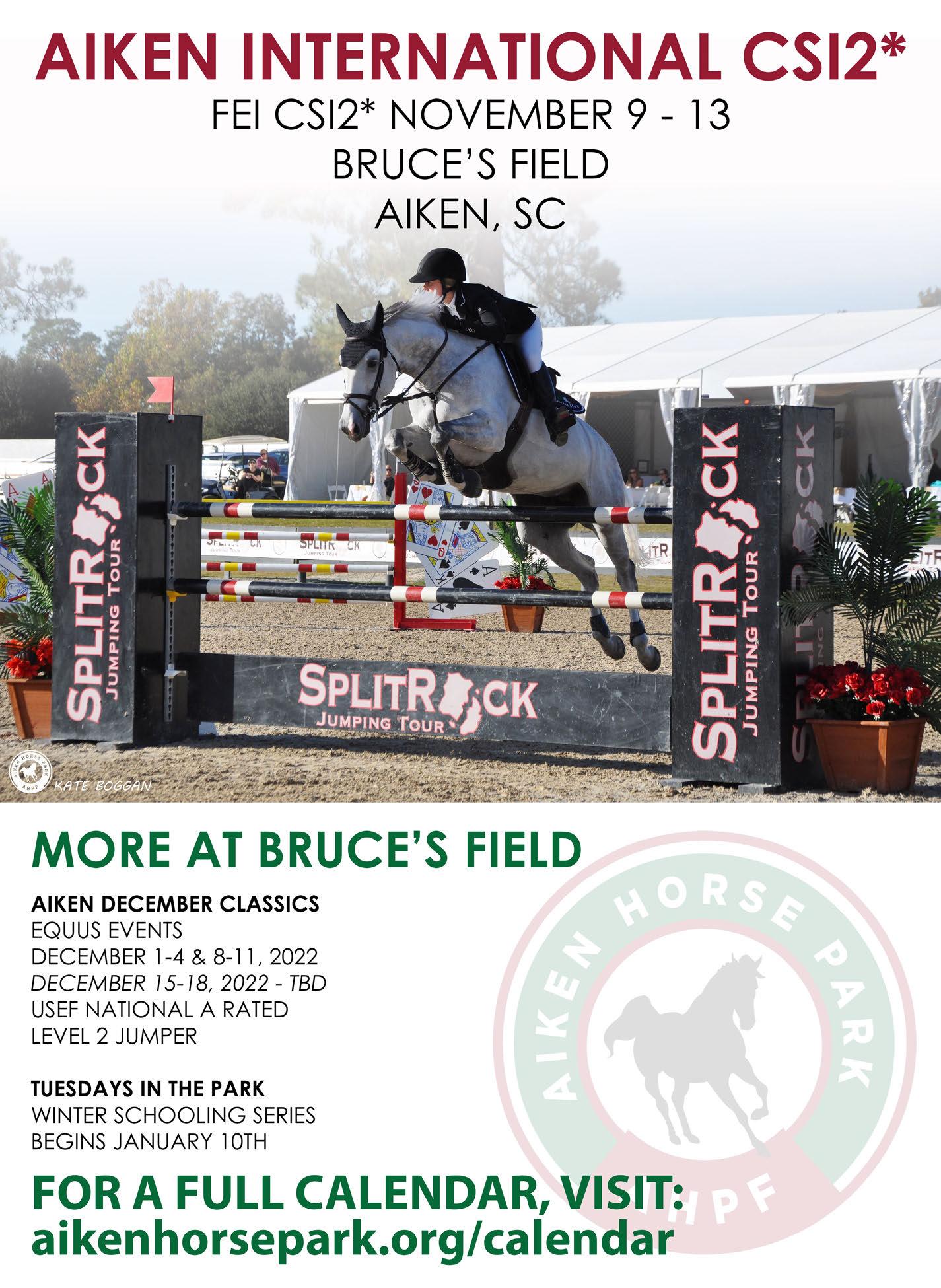 9-13 Aiken International CSI2*. Aiken Horse Park Foundation, 931 Powderhouse Rd, Aiken. 803.830.7077. tara@aikenhorsepark. org, aikenhorsepark.org