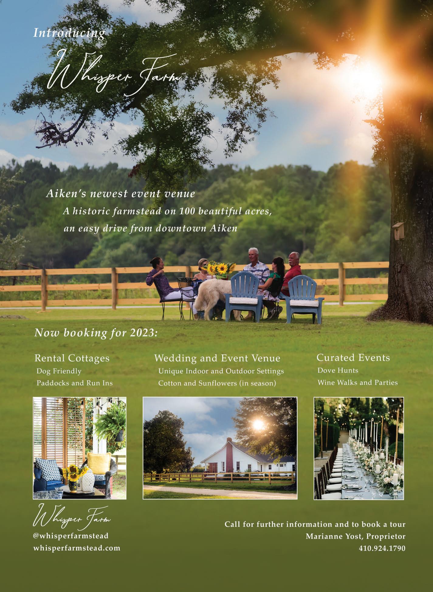 EDITOR & PUBLISHER Pam Gleason ART DIRECTOR Gary Knoll ASSOCIATE EDITOR Jean Berko Gleason LAYOUT & DESIGN Gary Knoll PHOTOGRAPHERS Pam Gleason Gary Knoll ADVERTISING 803.643.9960 theaikenhorse@gmail.com All contents Copyright 2022 The Aiken Horse The Aiken Horse Policies: The opinions expressed herein are those of the individual authors and do not necessarily reflect the opinions of the publishers, editors, or the policies of The Aiken Horse, LLC. The Aiken Horse is owned by The Aiken Horse, LLC.
