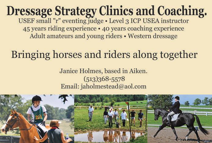 12 CT & Dressage at The Vista. 859 Old Tory Trail, Aiken. 803.262.5263, vistaschooling@gmail.com, schoolthevista.com