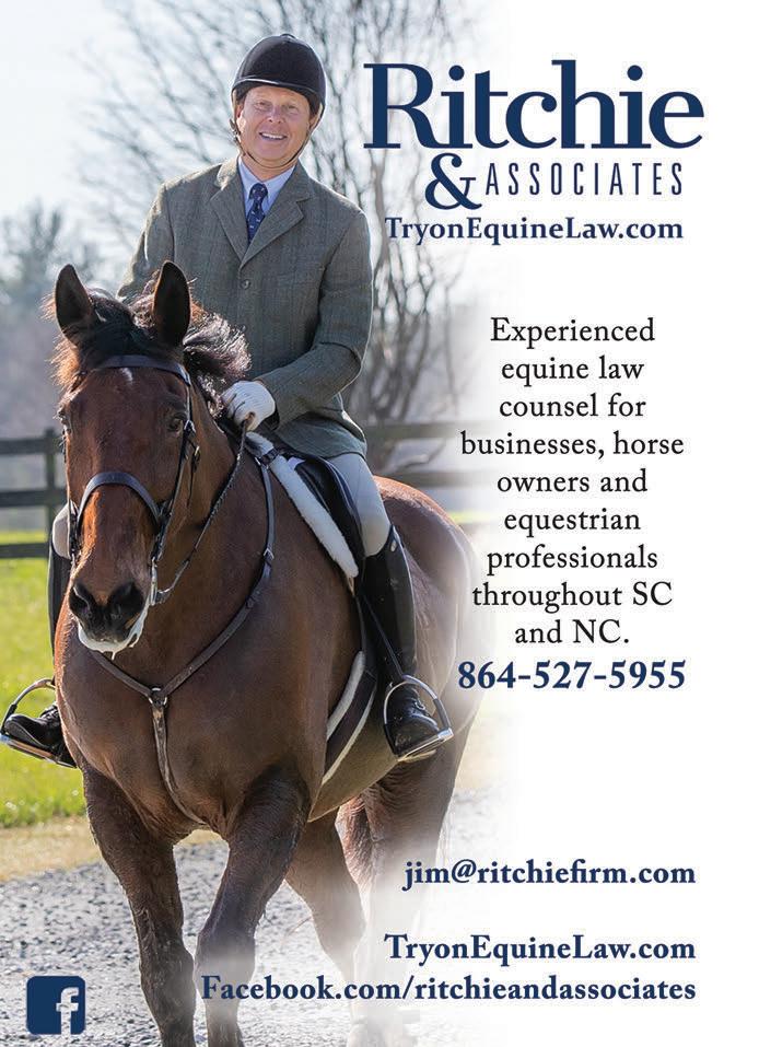 We hope you enjoy this issue. We have an article about Working Equitation, a relatively new discipline that has people talking, a story about the new faces at Aiken County Farm Supply, and a profile of Tom Murray and Steven Schachter of Viola Farm. We also have an invited essay about returning to riding by a guest writer, Elizabeth Letts, who is the New York Times #1 bestselling author of The Perfect Horse and the Eighty Dollar Champion. You will find that in Section One. Section One also includes our brief guide to the fall season – you don’t want to miss it! And Section Two features our annual regional directory of foxhunts, providing important dates and details for anyone who plans to follow the hounds this season. In our pages you will also meet the owner of the new western store Tumbleweed, as well as a retired 25-year old half Arab mare with four National jumping titles to her name. Learn more about the rules of dressage in our popular Ask the Judge column with Amy McElroy. There is more. Read on and find out!