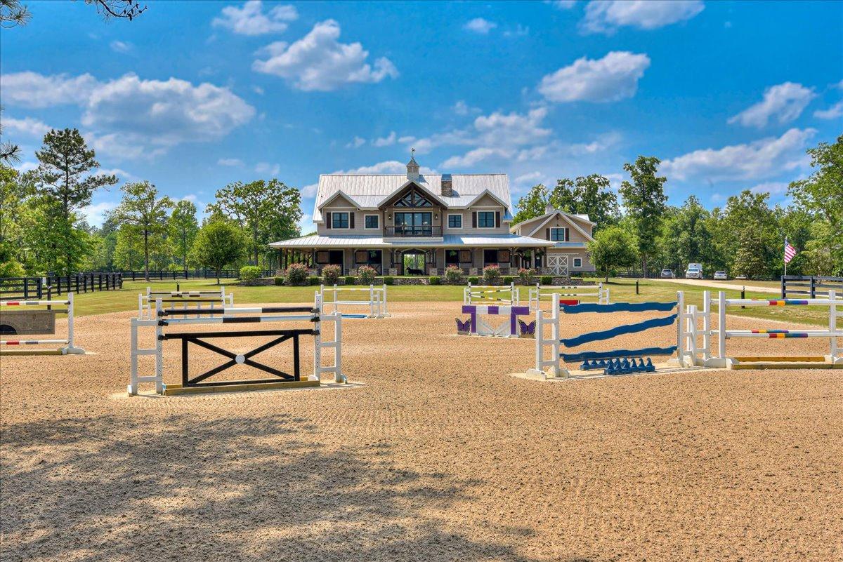 A farm w/access to miles of sand trails & roads for riding or driving. Beautiful 2 BR/2BA hardiplank Eric Martin home w/open floor plan, gas fireplace, center island kitchen w/Viking stove, barrel vaulted Douglas Fir ceilings, hardwood floors, accordion glass doors opening to a covered deck w/stone fireplace & screened enclosure w/travertine tile surrounding your 65’ heated gunite lap pool & hot tub. 2 car garage & matted storage area for equipment, carriages, tack & 2 grooming stalls. Wash rack w/hot/cold water, 2 run ins(1 w/stall divider), waterers, mats & fans w/grass paddocks & 3 board fencing & wire w/top board fencing. 2 additional larger paddocks. Dressage ring, greenhouse, appliances, & hazards convey. No HOA fee.
