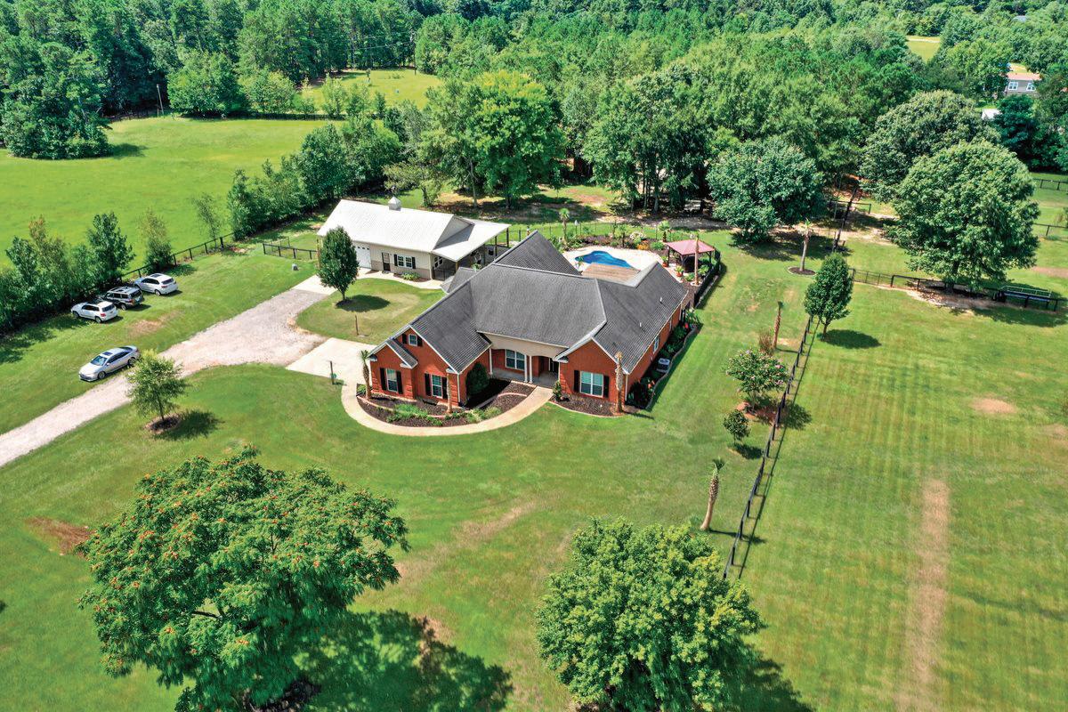 Hill Farm BARB GOULD USKUP 803.295.3199 | $825,000 Set on just over 5 peaceful acres only minutes from downtown and multiple equestrian venues, this lovely equestrian farmette leaves no detail unaddressed. Perimeter fenced 5.13 acre retreat suitable for any discipline has spacious, well-appointed 4 bed brick split floor plan residence with 3 full and 2 half baths. Home features well designed kitchen with granite countertops, stainless appliances, island & breakfast bar; large great room and formal dining room, spacious master and en-suite bath. Oversized garage with bonus area & half bath above. The backyard is a delight with landscaping, pool, hot tub, pergola, gazebo, and more. A 600 sq ft pool house with attached workshop/garage includes large living area, kitchenette, full bath and laundry hookups. Includes 3 paddocks and 2-stall barn surrounded by a 4th paddock.