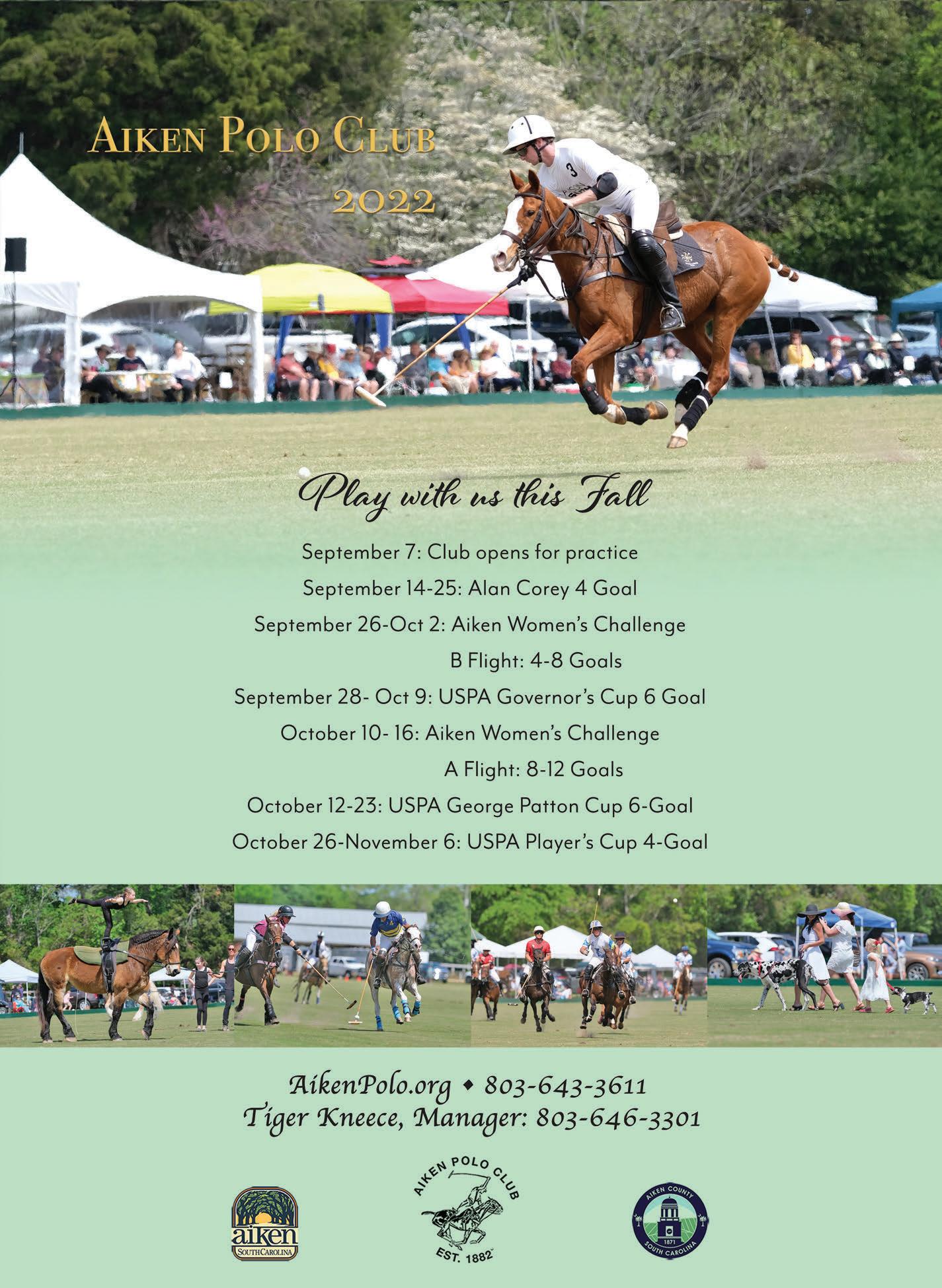Consult the websites for more information: aikenpolo.org (Hotline: 803-643-3611); newbridgepolo.com (Hotline: 803-644-7706); wagenerpolo.com (follow on Facebook for the most up-to-date information.)