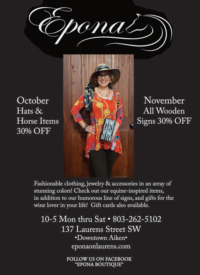 Welcome to the October-November issue of The Aiken Horse. Autumn in Aiken is one of our best times of year, not just for the weather, which is so often perfect, but also for the explosion of horse sports on our calendar. I know I have said it before, but I will say it again: Aiken is rapidly becoming a year-round equestrian destination, with a plethora of horse happenings every month of the year. But the fall and winter are definitely special. We have so much going on: tournament polo, eventing competitions, FEI showjumping, dressage, an annual Combined Driving Event in Windsor, the Aiken Fall Steeplechase, and of course, foxhunting which was one of the sports that first put Aiken on the equestrian map. On top of all this, we have racehorses, both Thoroughbred and Standardbred, returning to their respective tracks in the Aiken historic district, and seasonal visitors arriving from all over the country and the world.