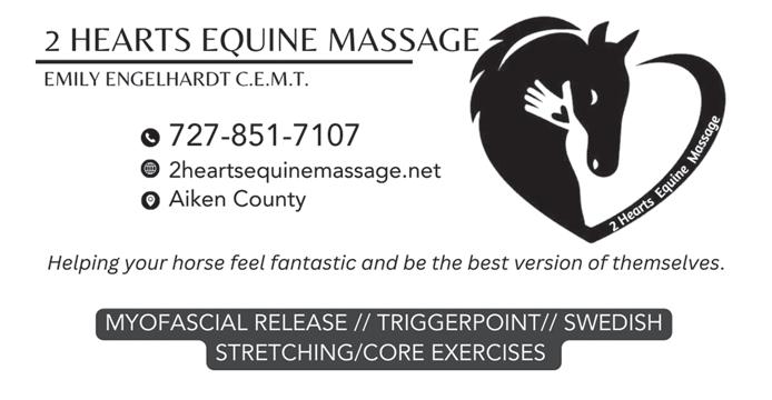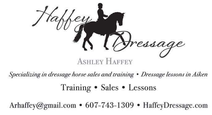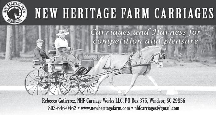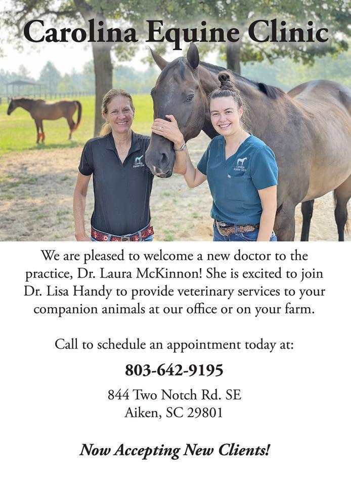 April-May 2024 The Aiken Horse 83 Outfitting Southeastern Farriers for Over 30 years Columbus, NC 828.894.0280 Aiken, SC 803.685.5101 GREAT SERVICE AND QUALITY FARRIER SUPPLIES ARE OUR PRIORITY www.monettafarrier.com ❦ Gently Loved Equestrian Tack, Clothing & Stable Supplies ❦ - Now Accepting Select Consignment Items❦ BY CHANCE OR APPOINTMENT ❦ 3914 Wagener Rd. Aiken, SC 29805 ❦ Cynthia & Jim Keating ❦ (803) 295-6901 or (803) 640-2339 ❦ ffif@aol.com