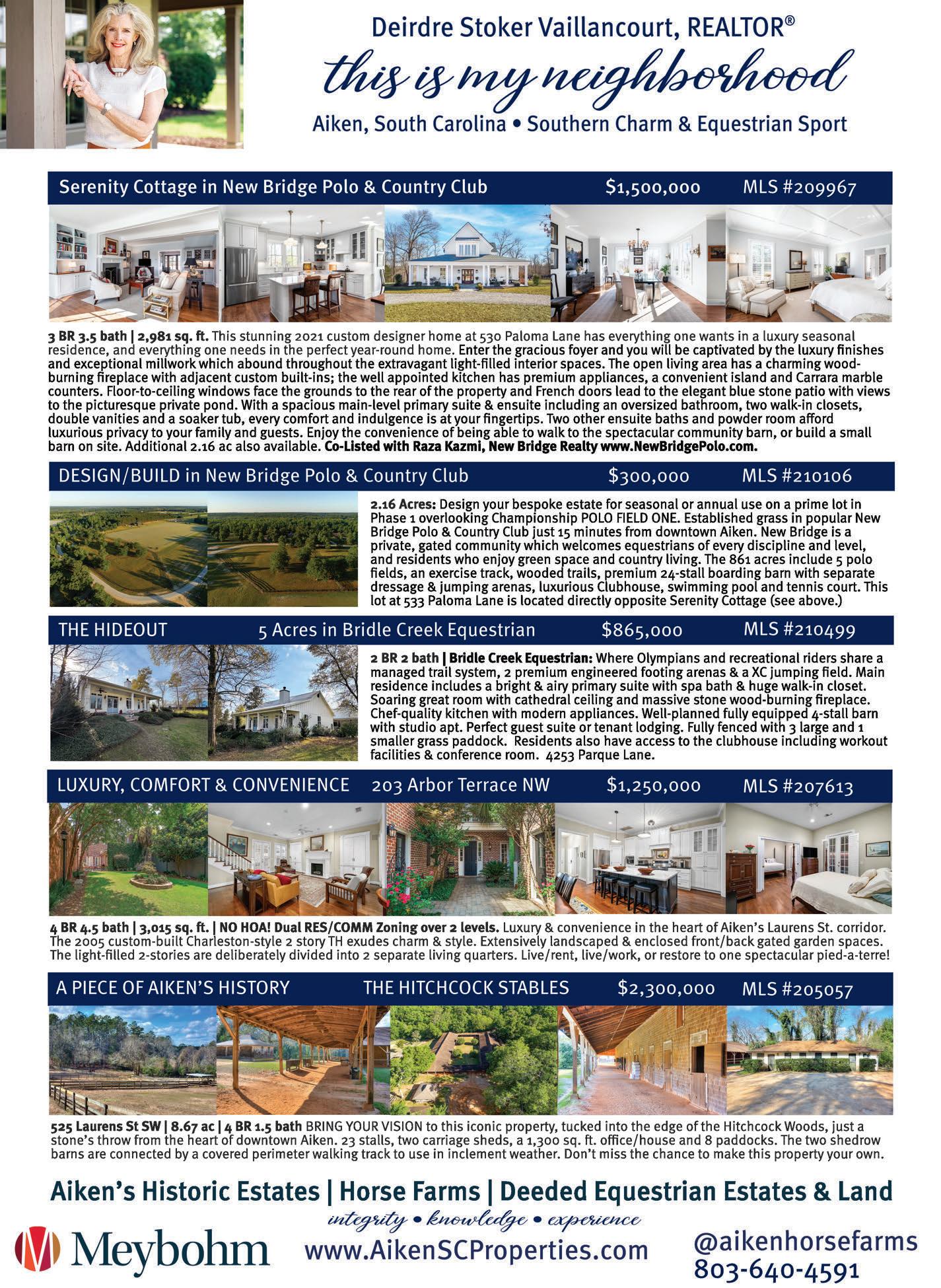 April-May 2024 The Aiken Horse 5 928 TWO NOTCH ROAD BLUE SKIES 704 HAYNE AVENUE SW MORRISON-WRIGHT COTTAGE Downtown Aiken, Historic “town“ home and beautiful gardens are ideal for entertaining and fine living. This well-renovated home will captivate those who appreciate the glamour of yesteryear & the harmony of formal, family and outdoor living spaces. Enjoy entertaining in the exquisite gardens or imagine a holiday tree gracing the front hall, visible through the front door, welcoming guests with warmth and cheer! We invite you to come see this sensational property to appreciate its restoration & exceptional livability! 5 BR + 3.5 Ba Home| 5926 SF | HEATED POOL Parking Court & 2 Car Parkng Pavilion Now Offered For $1,495,000 Don’t miss this horse-ready land with a delightful residence in Aiken's Horse District, close to Bruce’s Field! Two tax parcels combine for a 4.56-acre property with a gorgeouse open field for your equestrian amenities to add to the stunning, renovated historic home complete with a covered veranda, expansive Great Room with wet bar, 5 bedrooms, elevator, 3-bay garage, guest apartment, and equipment shed. Property is perimeter fenced and gated; has a well, generator & extensive irrigation system. Superb opportunity! 6 BR + 8.5 BA | 4.56 Acres | 3 Car Garage Guest Apartment | Perimeter Fenced & Gated Offered for $1,950.000 Prime building lots available in The Highlands at Barrington Farms present a unique opportunity to create your custom dream home or equestrian estate! With gently rolling wooded terrain and options for clearing pasture or building on a knoll, each lot offers a distinct charm. Barrington Farms is a prestigious community nestled in the serene beauty of Aiken's Banks Mill Equestrian Corridor, just minutes from Downtown Aiken, Hitchcock Woods, Bruce's Field, and the Sand Clay Roads of Aiken's Horse District. Lot 4-1, 5.03 Acres - $153,500 Lot 4-2, 4.75 Acres - $152,500 Lot 4-3, 6.97 Acres - $215,000 Lot 4-4, 6.94 Acres - $200,000 803-998-0198 | SullivanTurnerTeam.com