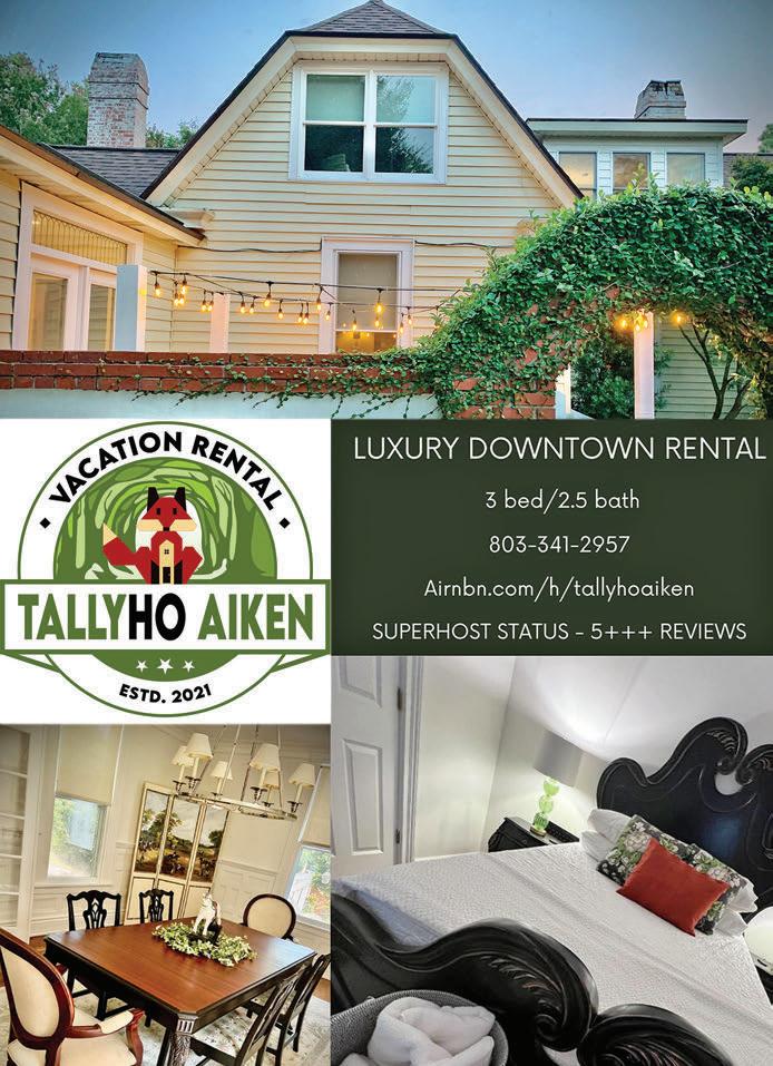 4 The Aiken Horse April-May 2024 Live Minutes to Clarks Hill Lake Looking to enjoy the lake life? Come see this well-renovated home ideal for indoor & outdoor living! Fabulous kitchen, baths & spacious back porch looking out to a newly fenced back yard. Ideal as a full-time residence or weekend retreat! 4 Bedrooms | 3 Baths 1.46 Acres | 3-Sided Carport | Outdoor Flex Space 6447 Ridge Road | Offered for $479,000 The Preserve at Whisper Farm Unique opportunity to build your private retreat, huntbox or farm in a superb locale, just off the 302 equestrian corridor, close to polo venues, practice fields and within hacking distance to live hunt fixtures. Enjoy inspiring pastoral views, beautiful sunrises, the sounds of nature and deeded riding trail! The Covert - Lot 2 - 4.27 Acres | $59,000 The Covert - Lot 3 - 4.81 Acres | $68,000 The Overlook - Lot 4 - 35.08 Acres | $484,000 Horses Welcome! 2.5+ Acres in Huntcliff Fun-loving home enjoys numerous living spaces for entertaining, including a Great Game room, in-ground saltwater pool, pool cabana & grill, outdoor kitchen and large storage / workshop areas to support your hobbies or side business. 4 Bedrooms | 3.5 Baths | 3814 square feet | 2.59 Acres | Pool & Outdoor Kitchen Building Lot in Kings Ridge Wonderful opportunity to design your dream home in one of Aiken's premier gated communities, Kings Ridge, known for its stunning gated entrance, elegant estate homes and horse properties. 5 Acre lot, easy access to the trail, adjoining the upper pond, which leads to the community riding arena and pavilion. The Sanctuary A stunning home and spectacular setting off the Banks Mill equestrian cooridor. The Sanctuary offers peace and privacy in a convenient location allowing easy access to Downtown Aiken, the Historic Horse District, Bruce‘s Field, The Vista and more. The Cottages on Fairfield Newly constructed, move-in ready cottages close to Downtown Aiken. Charm, style and low maintenance exteriors make these cottages a unique opportunity to invest in Downtown Aiken as a seasonal or full time residence with income producing potential. 4 Bedrooms | 2 Baths | 1561 sf | 1 Car Attached Garage 415 & 419 Fairfield St NE | $244,500 each Kalmia Cottage - Off Higland Park Rd Cottage charm and natural light are plentiful at this spacious 4 Br home with numerous outdoor entertaining spaces including a screened porch and expansive deck system! Enjoy sunny days in the fenced yard or visit nearby Kalmia Park and Hitchcock Woods. Easy access to Downtown Aiken, USC-A, Aiken Golf Club and Augusta, GA. 4 Bedrooms 3 Baths | 2926 sf | 0.70 of an Acre | 1 Car Garage | Fenced Yard 813 East Rollingwood | Offered for $495,000 Vespers Farm A slice of heaven tucked away at the heart of Aiken's beautiful 302 Equestrian Corridor, this 24+ acre estate combines master craftsmanship and elegance, boasting stunning details and sensible equestrian amenities. Ready for you to enjoy! 3 Br, 3.5 Bath Home |3273 Sf w/ Attached 3 Car Garage 24+ Acres | 4 Stall Center Aisle Barn | 3 Pastures | 2 - 4 Stall Run in Sheds | Hay Barn 772 Montmorenci Road | Offered for$1,625,000 Improved Price Coveted Location Near Horse District Nestled between Aiken's treasured Horse District and the oaks of South Boundary Avenue, this well loved and maintained home offers welcoming entertaining spaces inside and out, one bedroom down, gracious studio/flex rm and gorgeous inground pool. 4 bedrooms | 3.5 baths | 3366 square feet | Inground Pool & Fenced Yard 355 Magnolia Street SE | Offered for $715,000 302 Equestrian Corridor A low-density community of 12+ acre parcels with minimal restrictions to give property owners' flexibility to develop their property to their vision while maintaining standards to protect property values. ONLY 12 Parcels with road frontage on Bluffwood, Shadow Lane &/or Camp Rawls Roads. Build your Seasonal or Full Time Retreat! Ten 12 to 30+ Acre Lightly wooded Parcels Offered for $100,000 - $213,500 Historic Aiken 2.38 Acre Building Lot Once in a lifetime opportunity to design your private estate on coveted Berrie Road. Tucked away off a shared private road, you can enjoy views to Hitchcock Woods across Calico Creek, ride into the Woods, pop over to Palmetto Golf or take the golf cart for a Sunday afternoon polo match at Whitney Field. Tract C Berrie Road| Offered for $476,000 Under Contract Prime Development Opportunity 23+ Acres of Piney Woods with over 460 feet of Paved Road Frontage in central location with Easy Access to Aiken, North Augusta and I-20 to head west to Augusta, GA or east to Columbia, SC & just 15 minutes to downtown Aiken. Wide trails, good sandy soil & gently rolling terrain with Breezy Hill water line in horse-shoe shape on property. 23.1 Acres Connector Road | $470,000 803-998-0198 | SullivanTurnerTeam.com BeckyCissie Tracey Jenn Trust the Market Leader’s #1 Team in SC- 2020, 2021 & 2022 Leader in Luxury Sales Marie Lot 1 Sold Under Contract