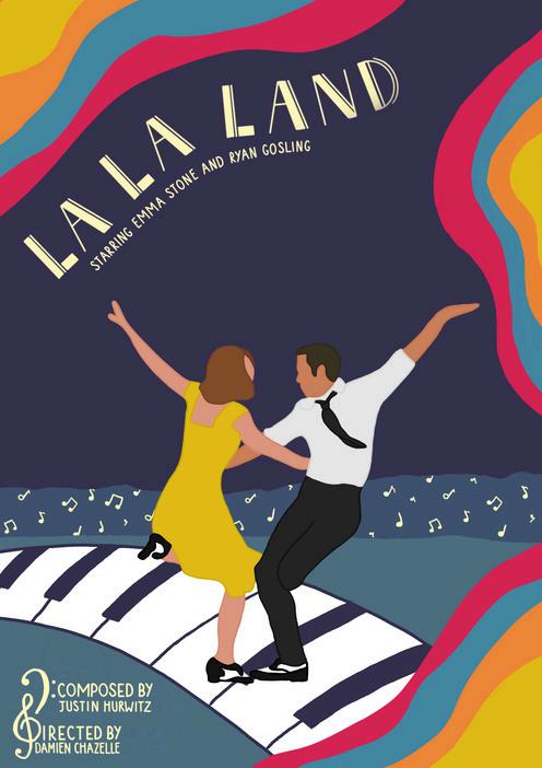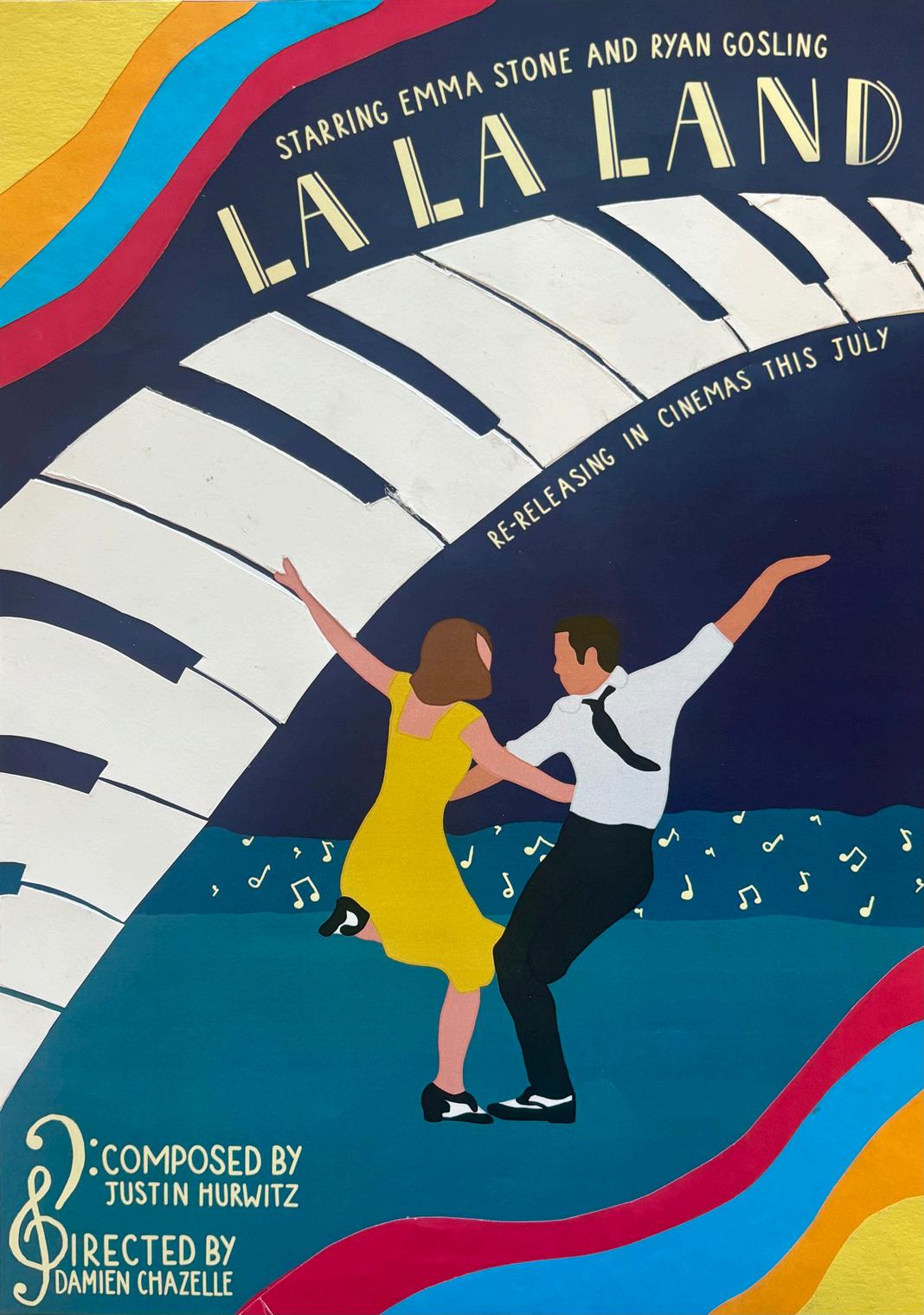 Work on imagery for the film La La Land, which was developed into a poster. I tried a variety of different layouts, and in the final one I chose, I incorporated paper cutout on the piano and coloured shapes to add some texture. FebMarch 2024.