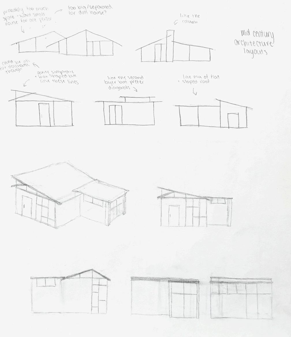 I developed my interior for my character, coming up with different layouts to put my furniture in. I then researched mid-century architecture and after looking at different classic silhouettes designed the exterior for her house, before coming up with a floor plan. To visualise her space in 3D I made a model out of foam which I would later like to create with more durable material. Sept-Dec 2025.