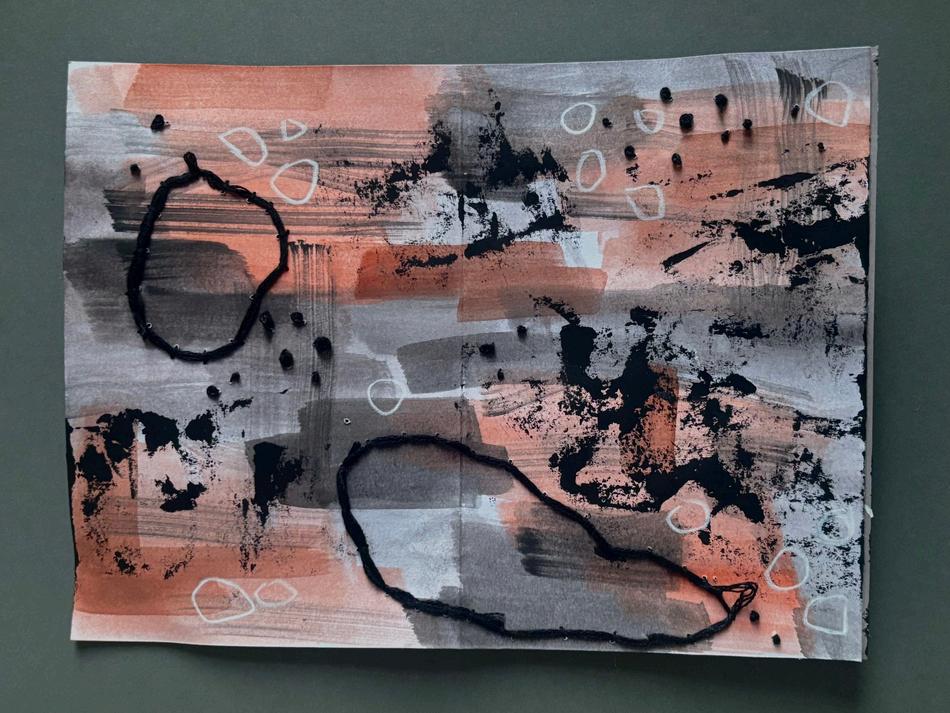 After experimenting with different prints and paper cutouts I wanted to combine these ideas. I made a few small pieces using watercolour, acrylic, cutout, prints, and embroidery, then bound them into an A6 sketchbook. From my original inspiration of deterioration I was able to create abstract work and a small cohesive book showing different techniques with unifying shapes and colours. January 2026.