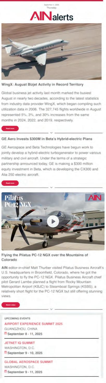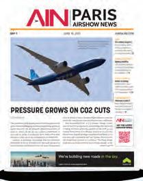 Aviation International News (ISSN 0887-9877) is published twelve times per year (monthly). Periodicals postage paid at Midland Park, N.J., and additional mailing o ces. Postmaster: Send address changes to AIN Media Group, 214 Franklin Ave., Midland Park, NJ 07432. Allow at least eight weeks for processing. Include old address as well as new, and an address label from a recent issue if possible.