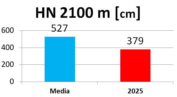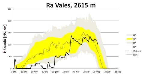 Lo spessore medio del manto nevoso HSimed ,fino alla metà di marzo è stato sotto la norma (fascia grigia). Con le precipitazioni di metà marzo è tornato nella norma ma poi è iniziata una rapida fase di ablazione, rallentata solo dalle nevicate in quota di maggio