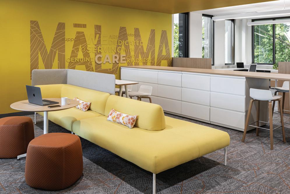 The new Kahului branch of Central Pacific Bank branch blends cultural motifs of Central Maui with midcentury architectural forms that honor the bank’s founding era. Designed with sustainable features along with a contemporary banking experience, the branch design celebrates its unique sense of place.