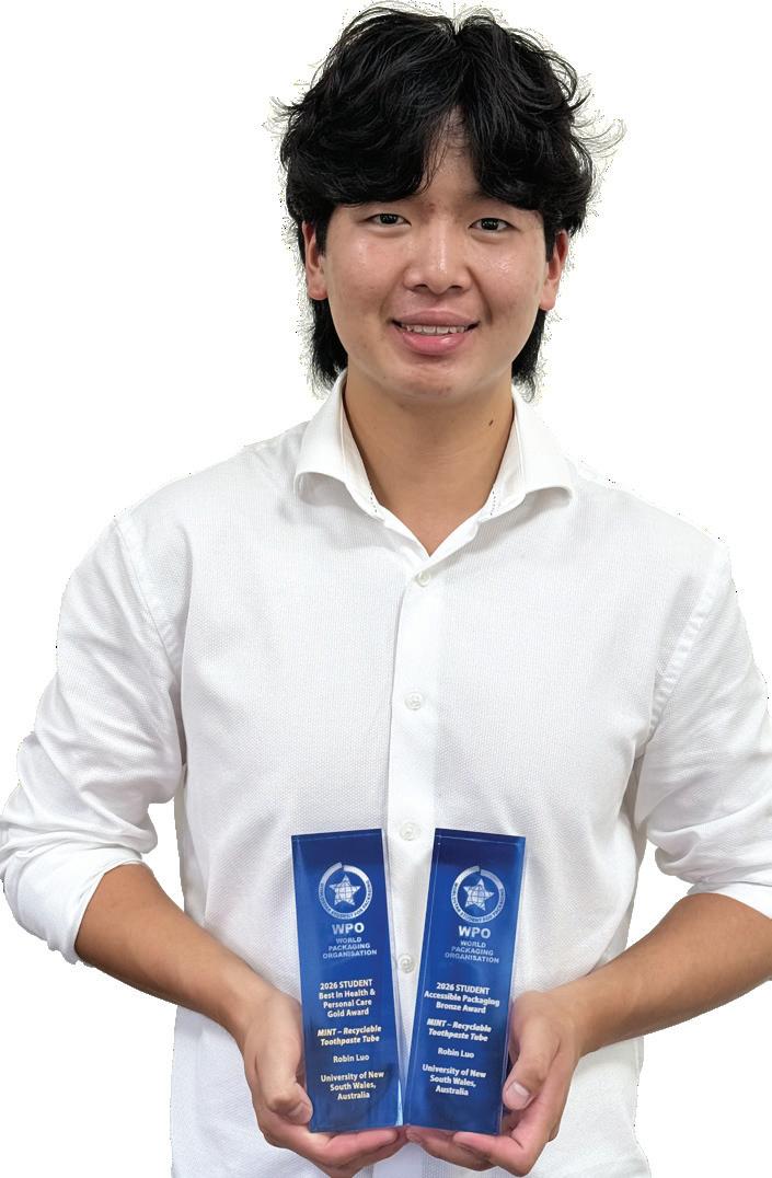 Adding to the Australian student success, Adriano Sturla Gomez, also from the Industrial Design School, UNSW, received a Bronze Award in the Beverage category for his project H2OLYTE. The redesigned electrolyte container prevents landfill waste by addressing sorting challenges at recycling facilities. Its optimised shape ensures compatibility with filtration systems, while reducing material usage by 30 per cent. Enhanced stacking and accessibility features maximise transport efficiency and consumer usability, making this a standout pack on the shelf. ■