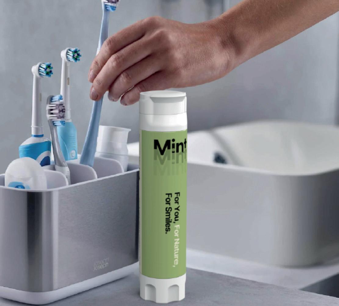 The Mint toothpaste tube was designed in response to the significant waste and environmental impact caused by traditional toothpaste tubes. The mixedmedia composition renders them