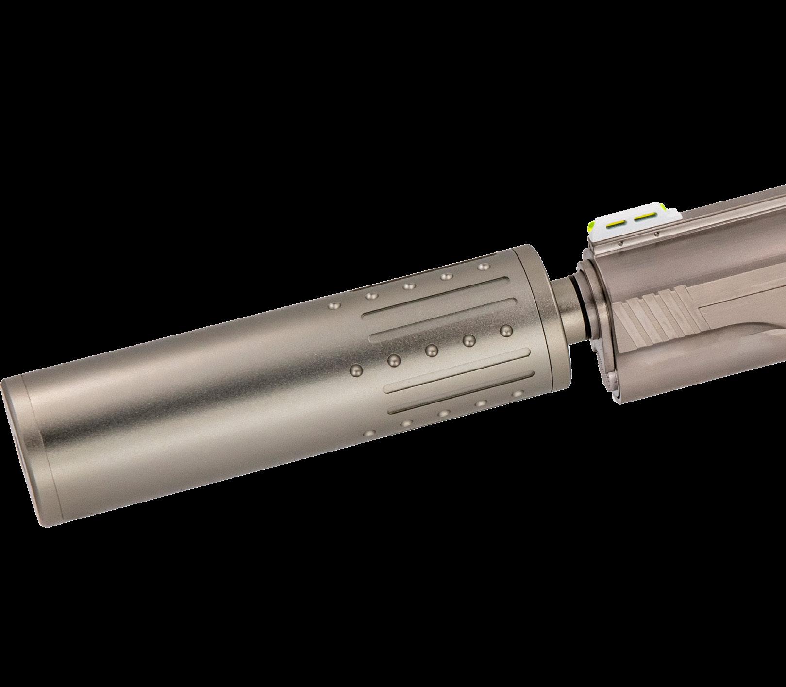With a 750mm, ridge-railed “hardballer-style” slide the VX-14 REQUIEM is the same length as the VX-9 AGENCY but feels much more modern and distinctly like it has more mass, although without a magazine fitted it is actually only 5g heavier than the earlier model (561g v 556g). This is actually pretty darn cool as both the slide and the frame of the REQUIEM have additional features and details added both for functionality and overall aesthetics. There’s extra, angled detail machined into the slide which will help with cocking and manipulating the new pistol, whilst the frame now boasts an accessory rail should you wish to fit a pistol light or LAM, and hi-vis fibre sights are another welcome update. Also following the lead taken on the VX-9, the VX-14 REQUIEM comes with a suppressor as standard, and the suppressor “kit” of both shroud and an extended inner barrel has been updated and shortened to create a compact package that is just 130mm long when everything is put together; the suppressor shroud also features a new “dash and dimple” pattern which is visually attractive too. Gone though are the hybrid wood/ rubber wrap around grips of the VX-9, replaced by stylish and functional polymer grips in statement “REQUIEM White”.