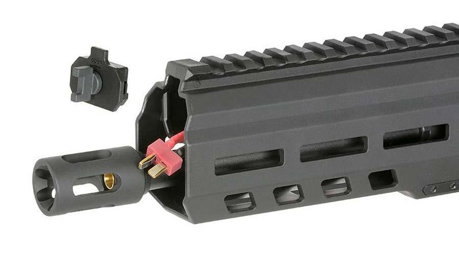 One interesting little (quite literal!) twist on the DMP9 is the battery compartment, and you’ll find this neatly tucked away inside the handguard. Unlike many shorter AEGs though you don’t need to remove the handguard to change the battery, as to access the compartment there is a removable plate just beneath the front of the handguard which, by twisting the mock gas-plug, can be removed to find behind it quite a generous space for a small stick LiPo via a Deans/TPlug connection. I actually like this as a batterystorage solution on a small-footprint AEG a lot, and when the battery is in and the plate put back in place, the battery disappears completely so the DMP9 continues to look very cool!