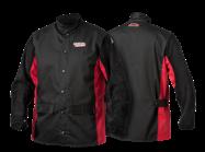 • Fashionable Welding Jacket with durable split cowhide sleeves • Combined with cool flame retardant material on the chest • A flip up collar is secured by hook and loop and a lined flap on the back snaps closed for extra protection • Two horizontal hip pockets with hook and loop secured flaps stow personal items